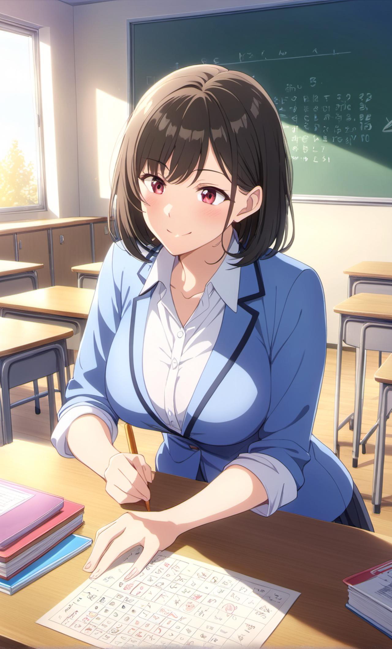 一个老师看见学生有题不会便去教他并告诉他答案 李老师是一个经验丰富的教师,身穿深蓝色西装,戴着一副眼镜,常带着和蔼可亲的微笑。他总是耐心地指导学生,有很强的责任心和教学热情。
