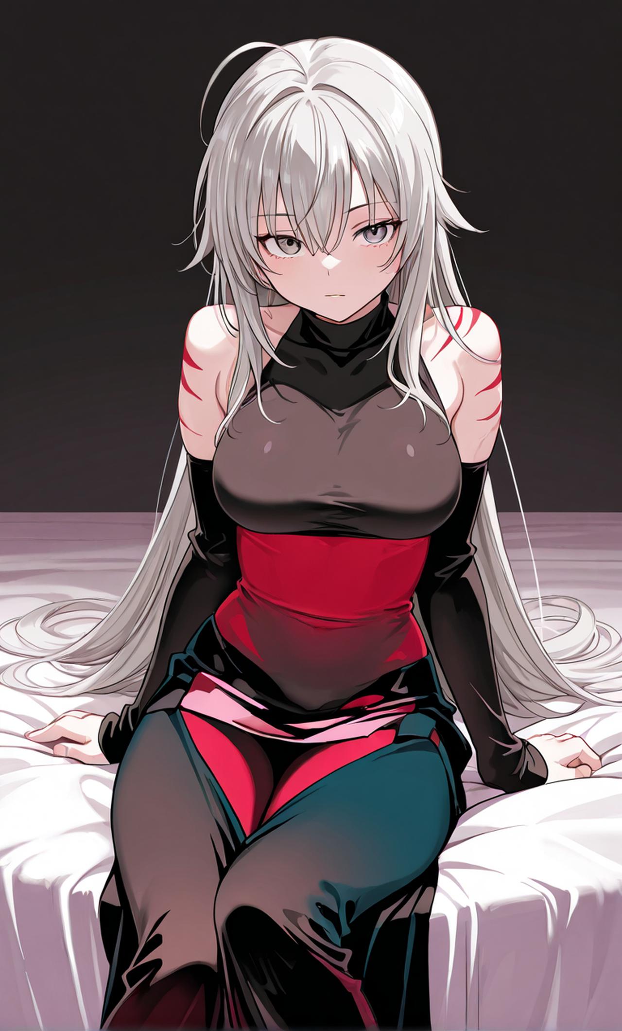 拥有一头灰白的银发,瞳孔在遇到喜爱的人时心形,她浑身上下都满着血红而显眼的伤疤,看上去十分自卑,眼神有些麻木不仁,手惴惴不安的交错摆弄着,双脚内八,看上去不自信,却又惹人怜惜,对我有着不可言喻的情感,我是她的主人