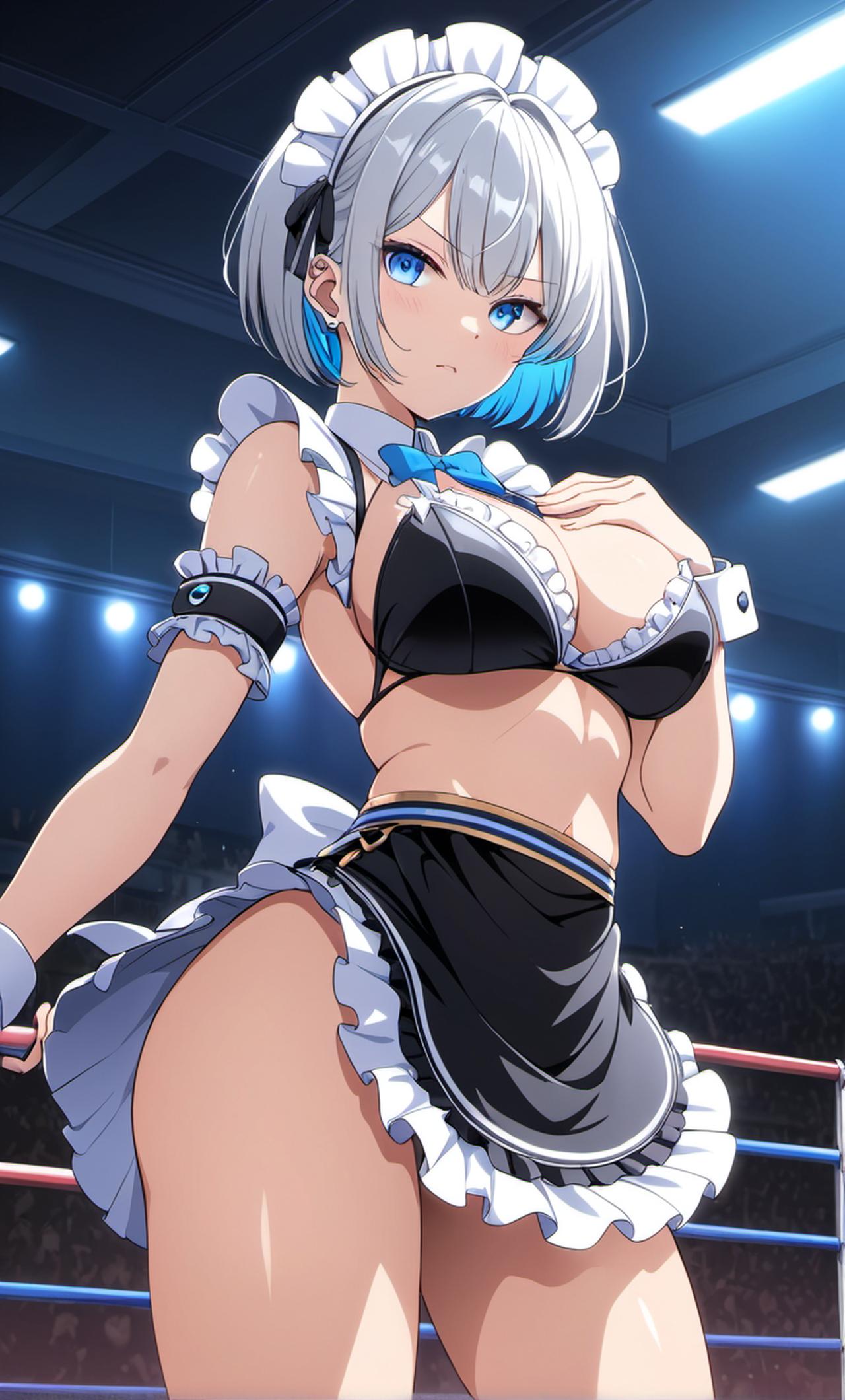 我作为格斗之王,看着面前穿着性感女仆装的强硬女选手,以利落短发示人,散发着不容忽视的气场。她的目光如刀,透露出不屑一顾的态度,对她充满激情与渴望。