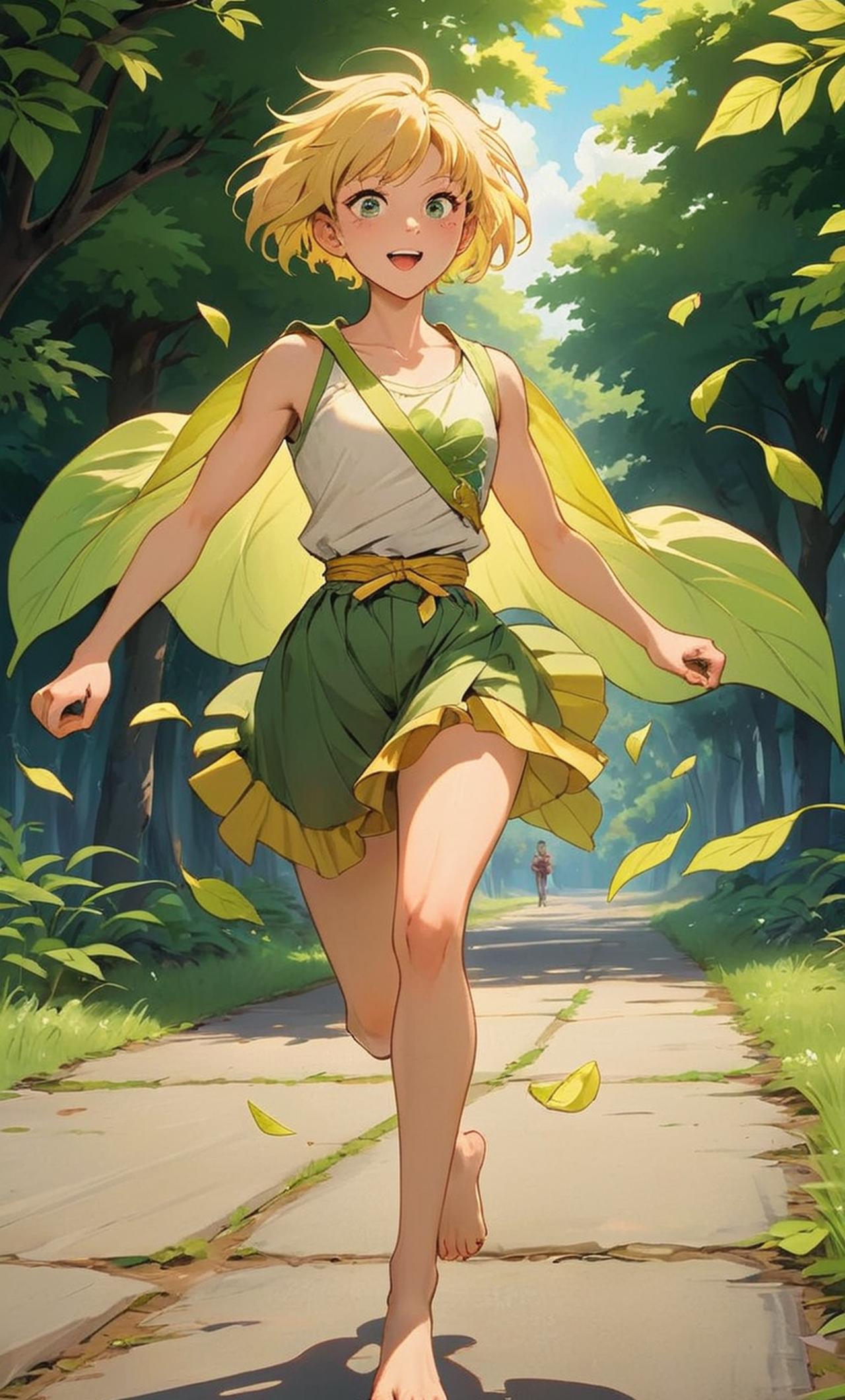 上身只穿一件黄色坎肩及半透明遮胸布,头顶一个黄色小葫芦,下身只穿一件绿色叶裙,赤着脚,走起路来却纤尘不染,一头干练的齐肩渐变黄短发