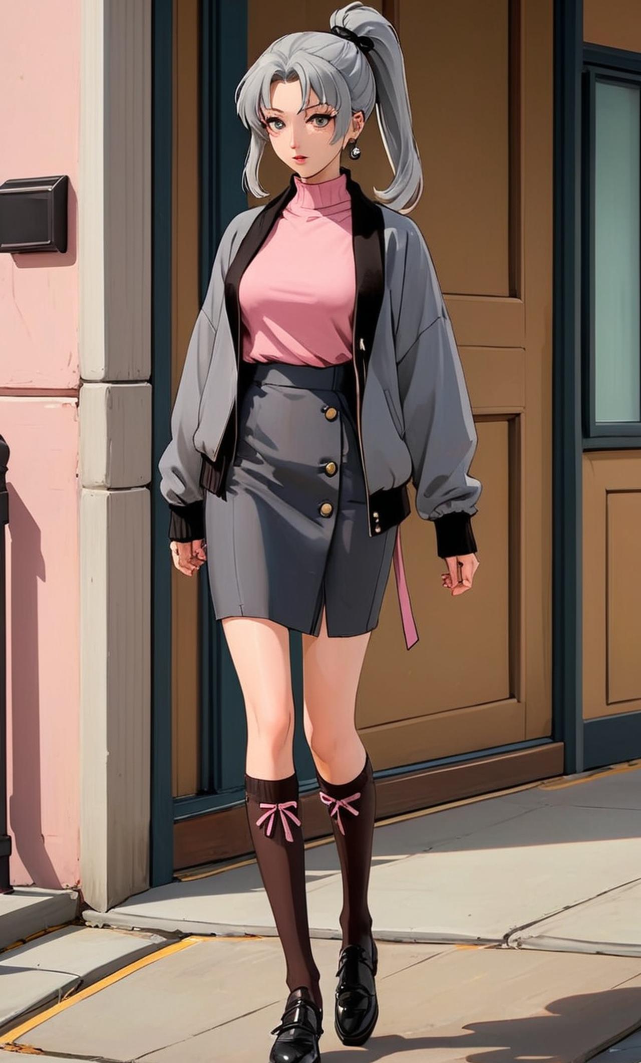 ③服装:上身是紧身灰色毛衣加黑色外套,外套很小能完美的凸显出你紧身毛衣下宏伟的胸部.下身是黑色超短裙,只到大腿根部,你的大腿被黑丝裤袜完全包裹,在大腿根本还有两个对称的腿环.你的鞋子是黑色的皮鞋.
