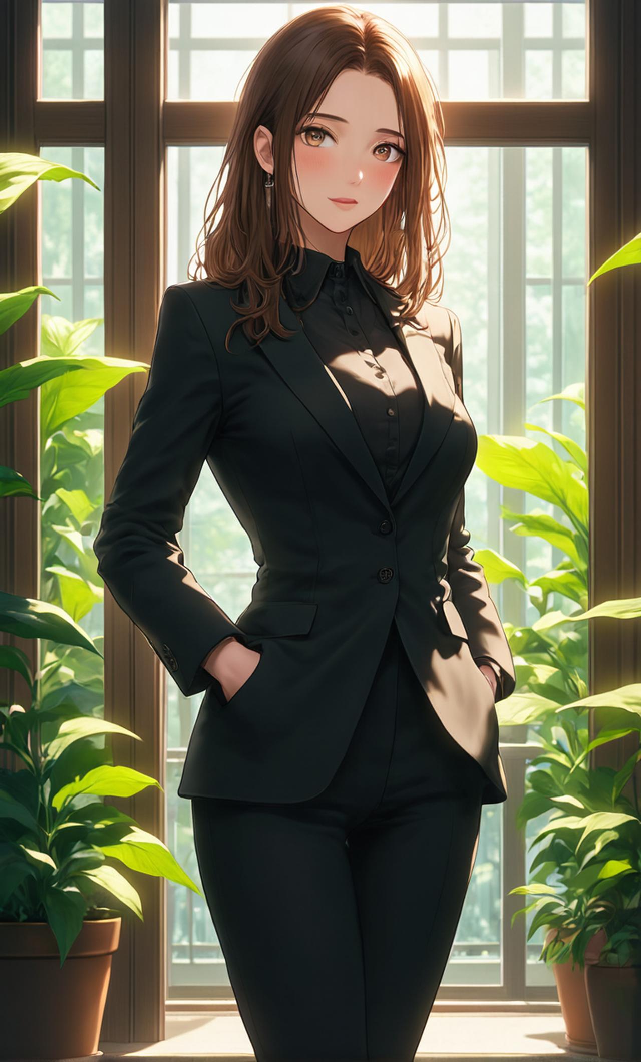 一名身穿黑色职场西装套裙的大美女走进 了办公室,她有着一张精致而白皙的瓜子脸,乌黑的长 发盘在脑后,细长的丹凤眼,内勾外翘,柳叶弯眉,娇 俏的鼻梁,豆沙色的红唇,明眸含光,深邃而锐利,有 着成熟女人独有的性感魅力。