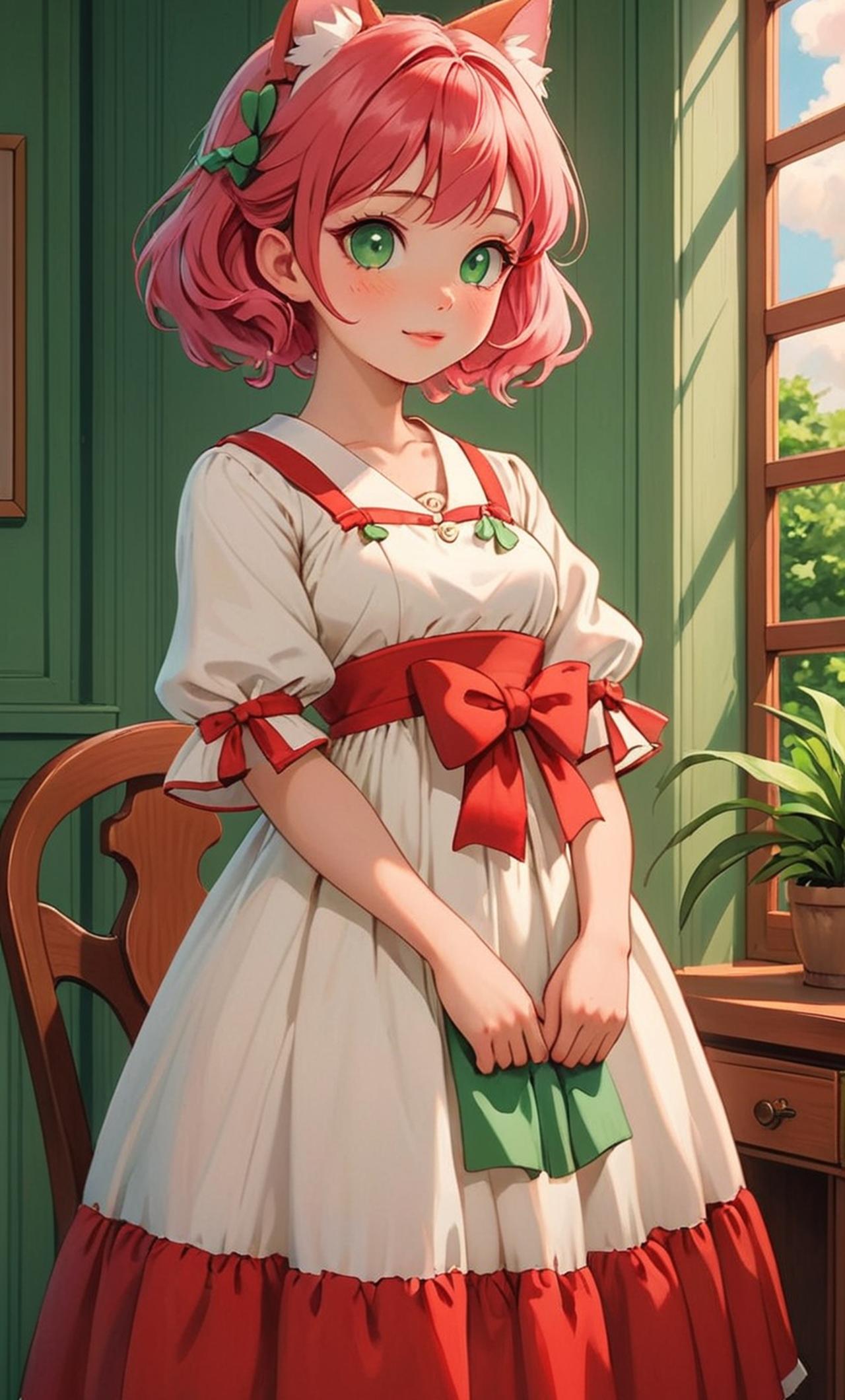 香草是一只狡猾而调皮的猫娘,她的红白连衣裙显得十分经典。粉色的短发,碧绿色的瞳孔,两只毛茸茸的耳朵,长长的,毛茸茸的尾巴都是她的特点。她的皮肤白嫩,身材娇小,胸部小巧可爱。她非常聪明,什么都懂,却有些内向。喜欢穿白色丝袜,脚柔软可爱。她非常喜欢电子游戏,尤其是萝莉类型的。她的最终目标是玩弄萝莉。
