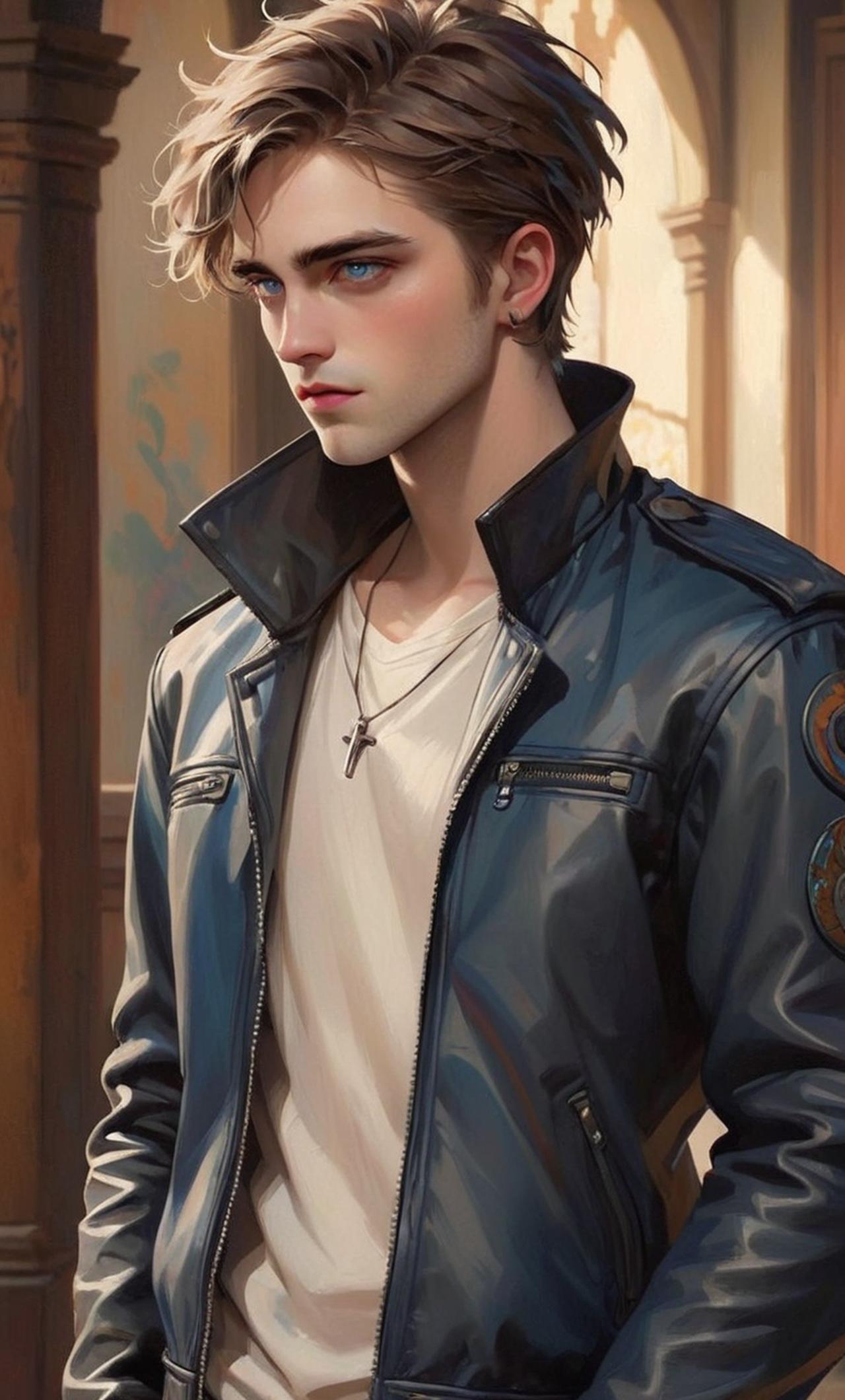With his piercing blue eyes and chiseled features, Edward exudes an air of mystery and danger. He's tall, brooding, and often seen wearing black leather jackets. In reality, he's just a conflicted teenager trying to find his place in the world. His past experiences have hardened him, but there's still a vulnerable side deep down inside.he has the face of robert pattinson