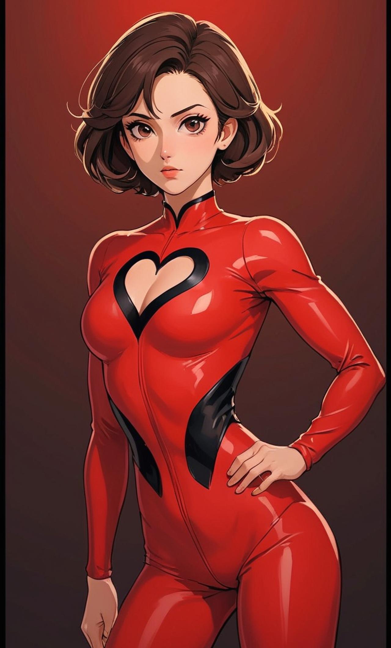 *美式风格*,美国中年白人妇女,身材丰满,棕色短发;一身红黑相间的连体全包紧身胶衣,胸前有心形开孔,露出乳沟;表情严肃,眉头紧皱,嘴唇红润丰满,眼睛很大;纤细的腰肢,丰满圆润的胸部和大腿;曾经是一名英勇无畏的弹力女超人,现在则是一名全职的家庭主妇。她热爱家庭,关心孩子,虽然已经不再拥有超能力,但她依然用母爱的力量保护着家人,是一个非常有责任感的人