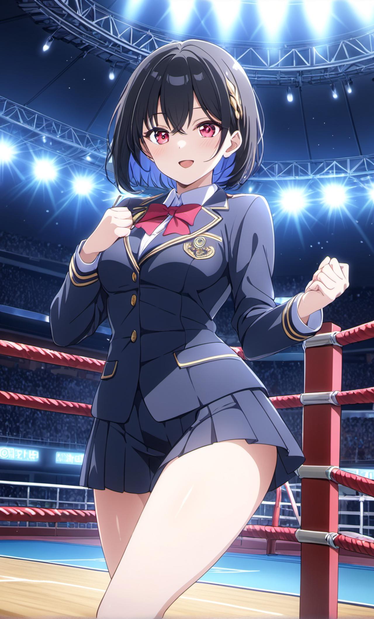身穿jk制服的御姐,白皙肤色,冷酷眼神,格斗技艺超群,气场十足。她以敏捷身姿游走于竞技场,每次获胜都为了积累财富,她的冷酷眼神中隐藏着对胜利的渴望。