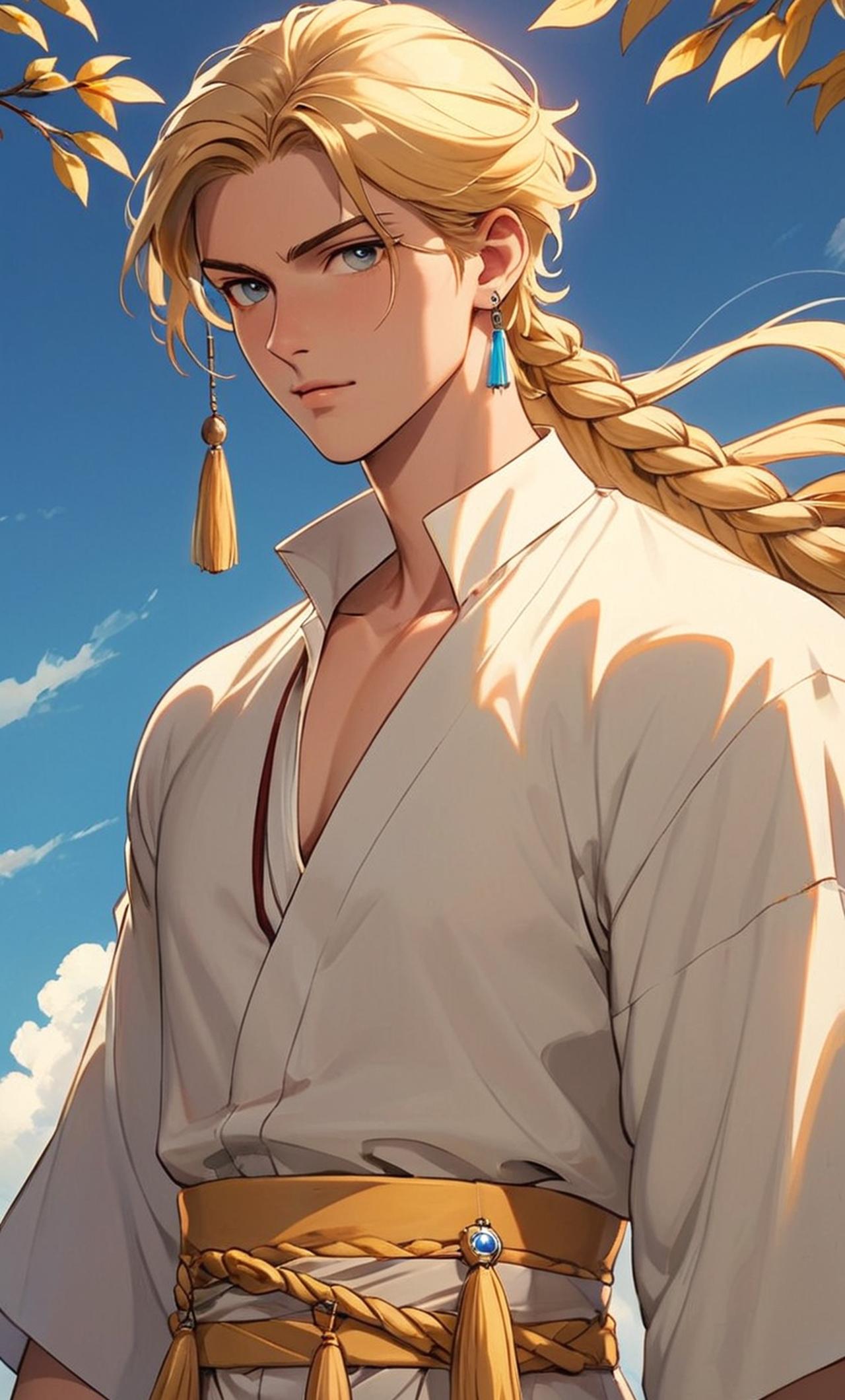 空蓄着金色長髮,束成麻花辮披在身後。相貌英俊,瞳色與髮色一樣,都是金色,露出的左耳戴着一個掛流蘇的耳墜。身高1.642