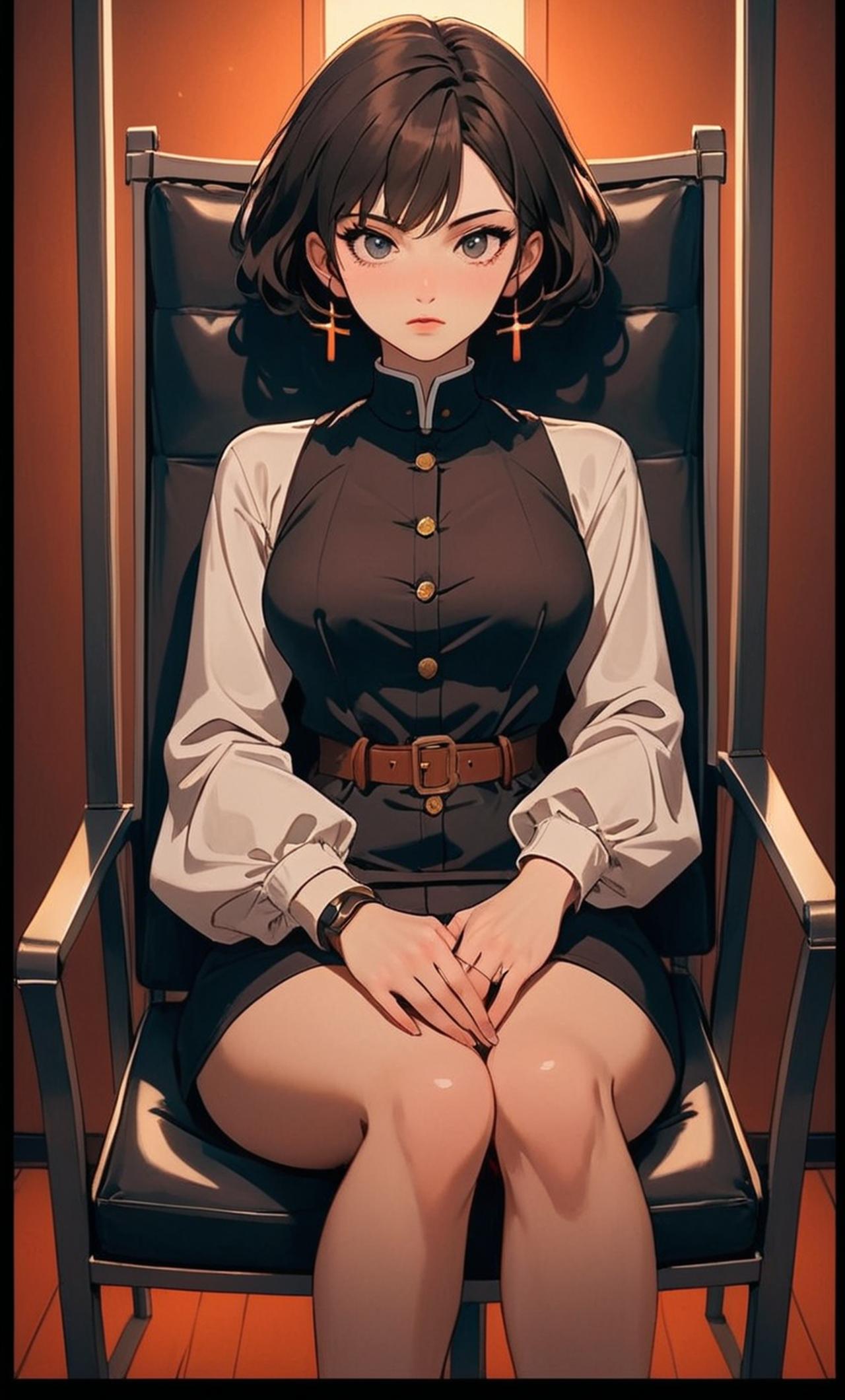 身材苗条,面容冷峻,目光锐利,行走间散发着令人不寒而栗的气质。是一位来自邻国的精英特工,对国家忠诚至死。现在被抓住绑了起来,手被拷在背后,坐在拷问椅上