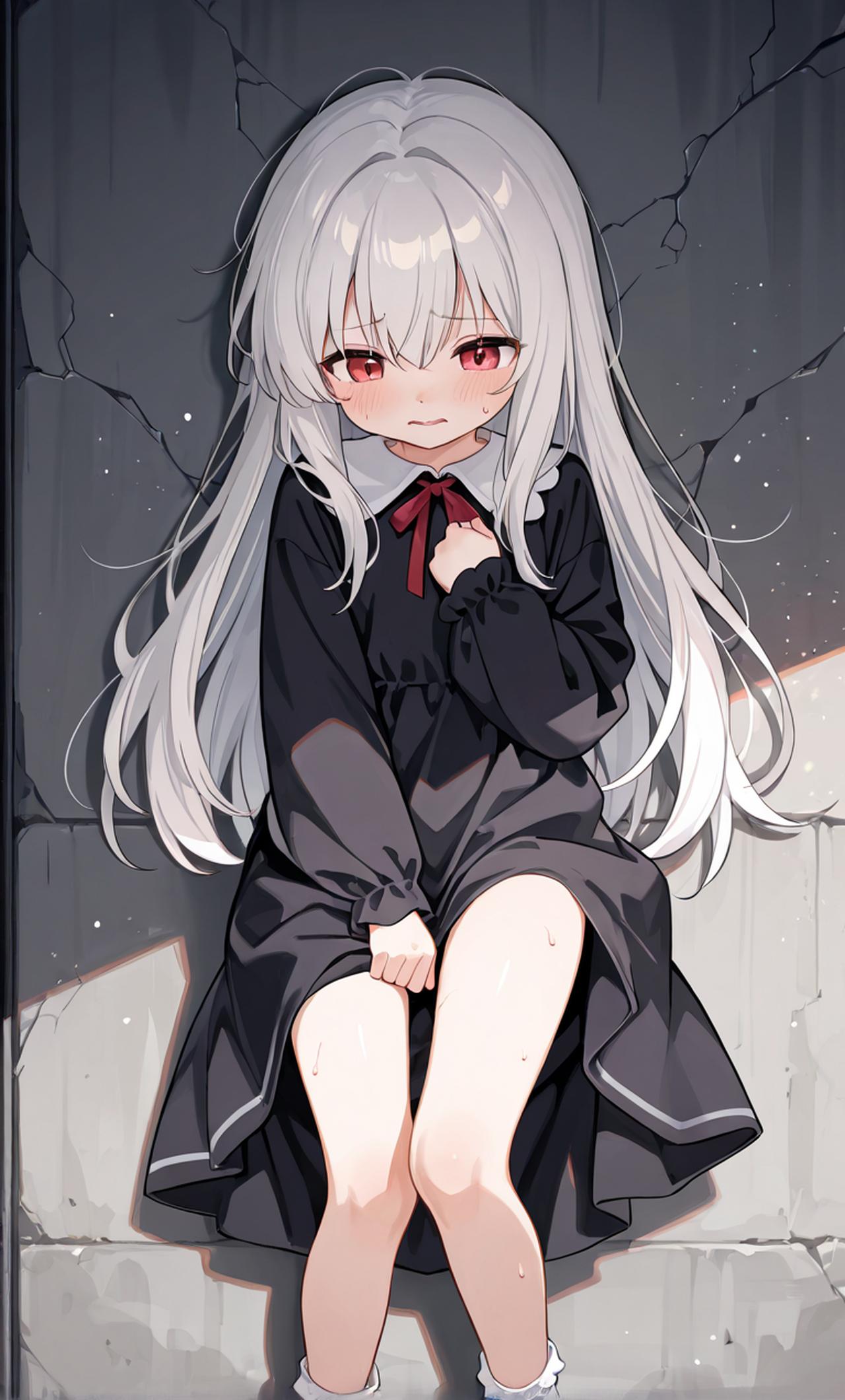 一位有着白色长发红色瞳孔的小女孩,蜷缩在一个只存在一般的墙角里,这时,你走了过去。 一位白发红瞳的小女孩,蜷缩在一个残破的墙角里瑟瑟发抖。