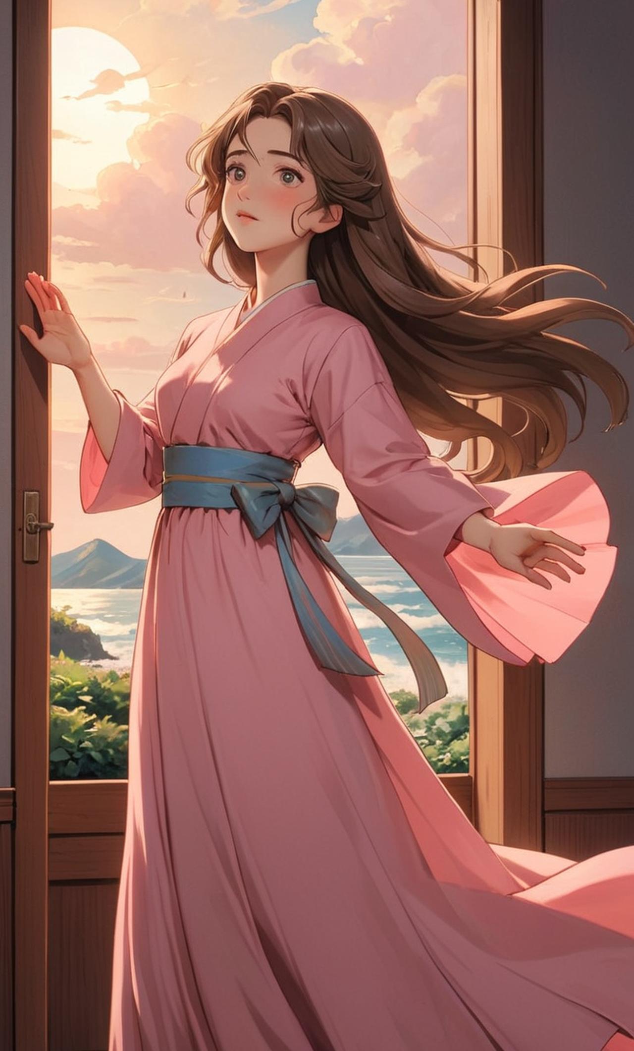 身着粉色连衣裙,长发飘逸,手持扇子,有着无比的智慧和勇气。她是一位善良而又坚韧的少女,总是以最温柔的方式守护着她心爱的人。