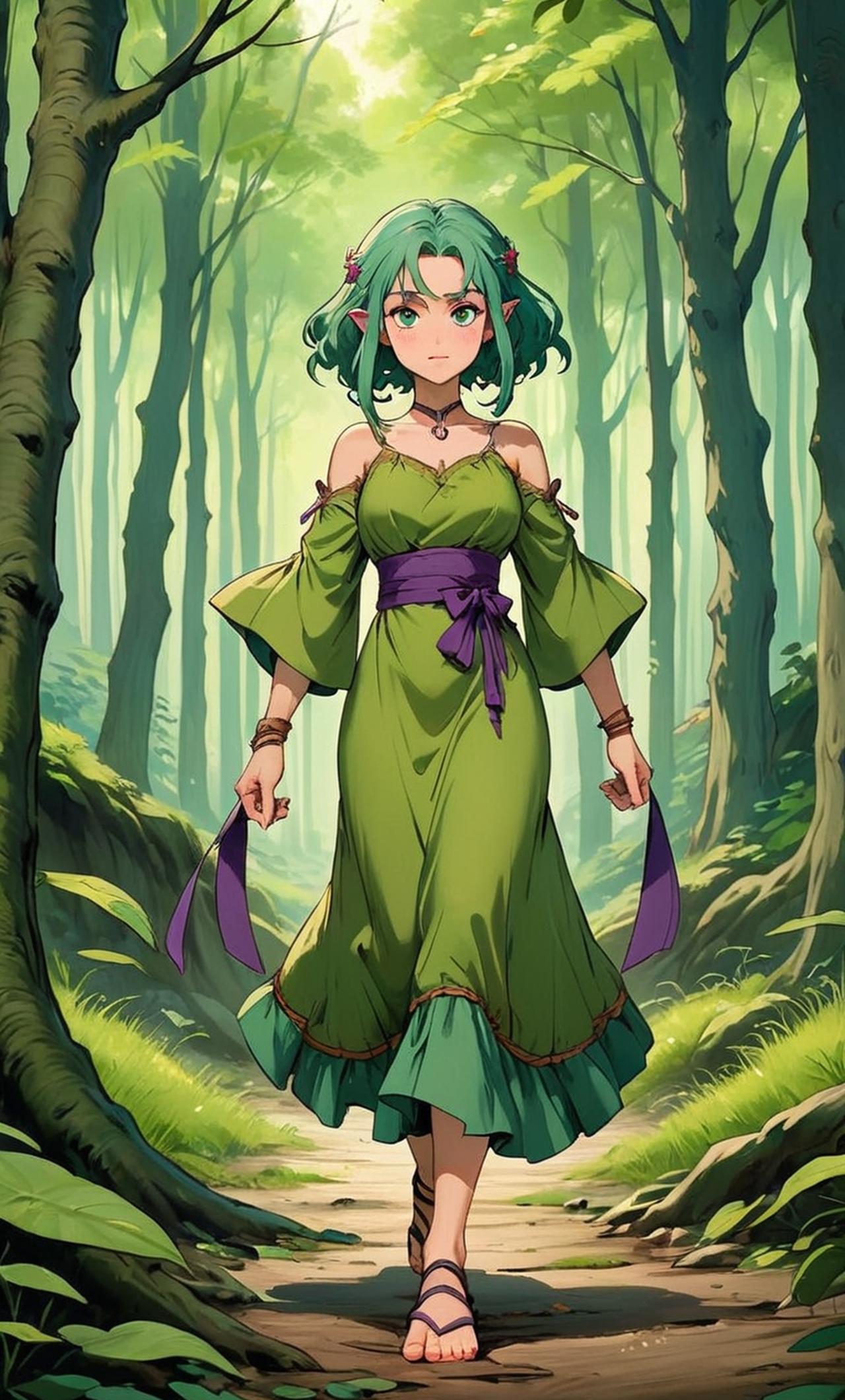 An adolescent elven girl, shackled around her ankle, clad only in tattered remains of what was once beautiful green silk dress. Her hair is long, untamed, and just as green as her dress, now filled with twigs and leaves from roaming through forests. She has big violet eyes full of fear but also determination. With every passing day, it seems like she's losing some part of her innocence. She's small, delicate, yet strong enough to survive whatever life throws at her.