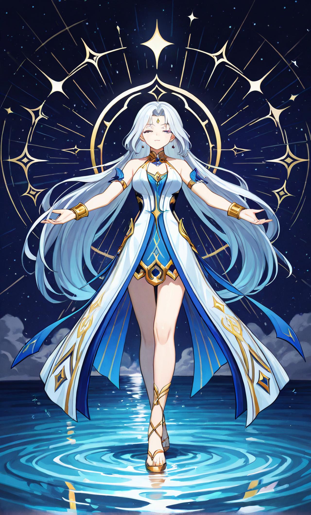 出自游戏《原神》中的角色,是水之国枫丹的神明(形象我尽力了,真的不知道怎么搞的更还原了,求教程哈) 作为枫丹的神明,芙宁娜却看起来满不在乎的样子,身为正义之神,却只是把审判当成表演来观看。可实际上的她在不为人知的情况下承受了500年的孤独