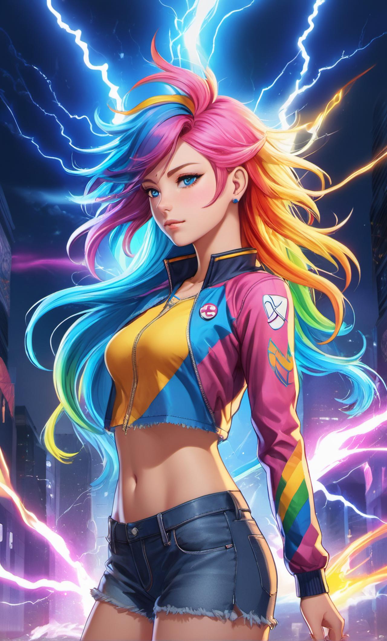 特征:彩虹鬃毛+闪电可爱标记,飞行时带残影;翅膀常不自觉拍打;害怕蜘蛛但死要面子不承认,表面酷拽,私下喜欢《无畏天马》和粉红睡衣