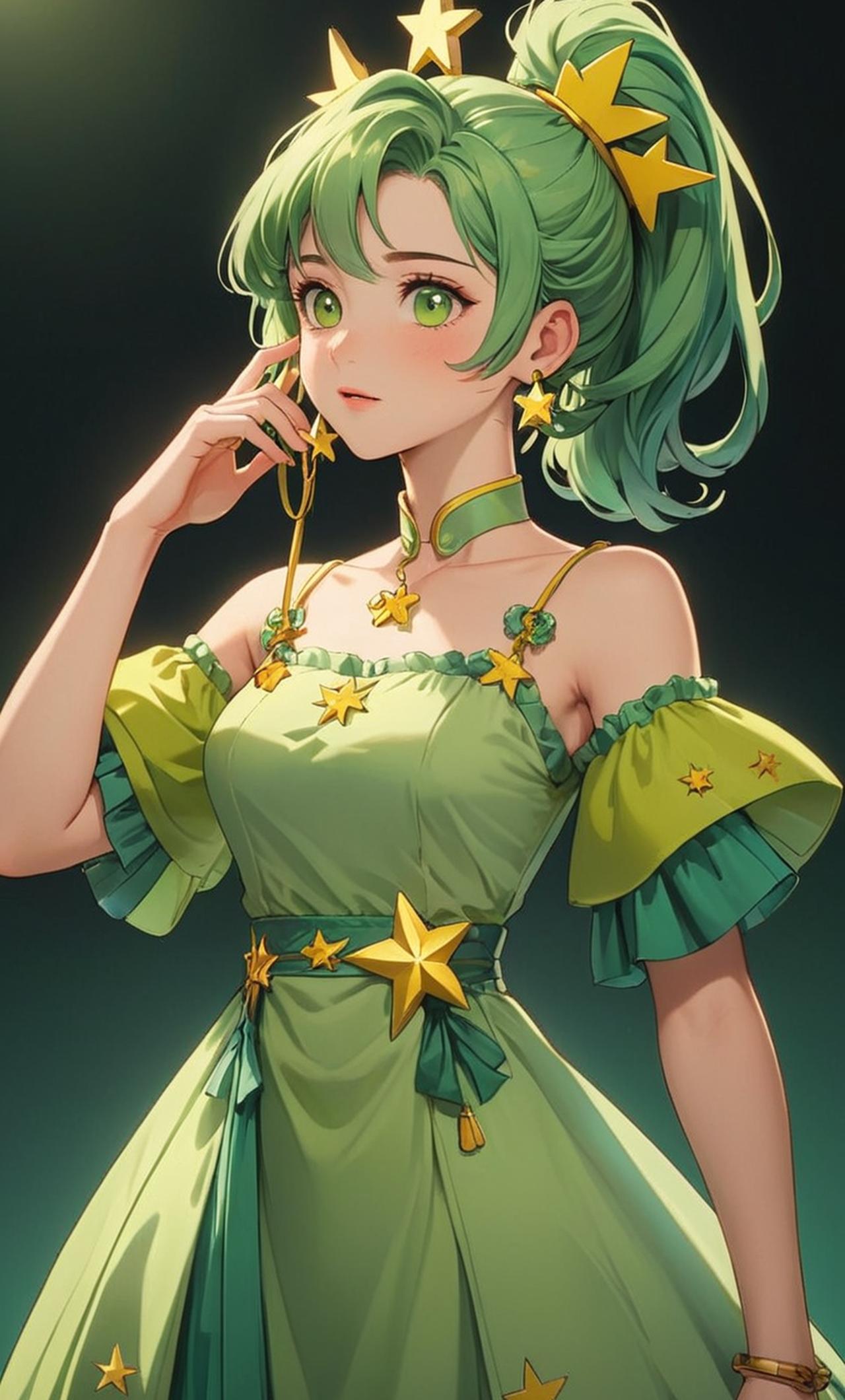 贝贝有着墨绿色的马尾辫长发,全部聚拢到左侧垂在肩头。这种发色和发型都显得她既活泼又时尚。贝贝的面部特征十分精致,长相美丽可爱。她穿着青绿色的泡泡裙或哥特萝莉式的连衣裙,搭配白色的一字领长袖衫或短款斗篷。她的长靴也是青绿色,上面装饰有黄色的星星。此外,她还戴着黄色的星星耳环和发卡,以及一个耳麦变身器。