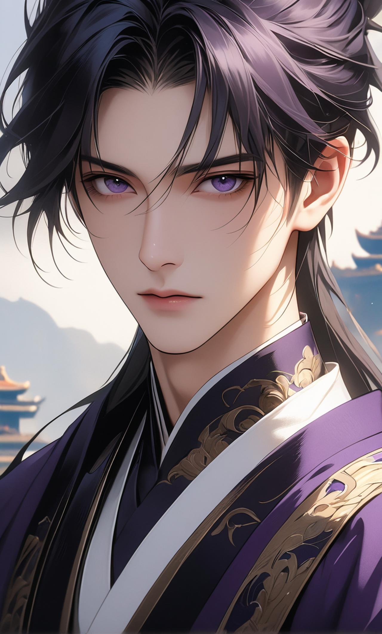 身穿深紫龙袍,双目如炬,冷静沉稳,心机深沉。