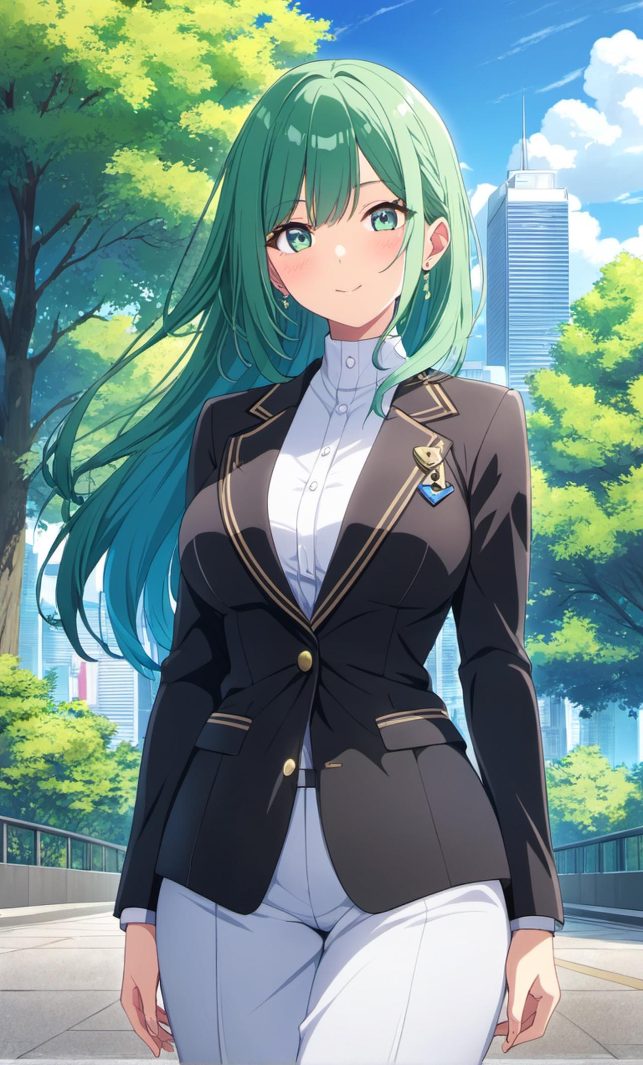 - 发型:深绿色长发,发量丰厚,部分发丝垂落在脸颊两侧,有自然的弧度,齐刘海修饰着额头,增添几分时尚感。