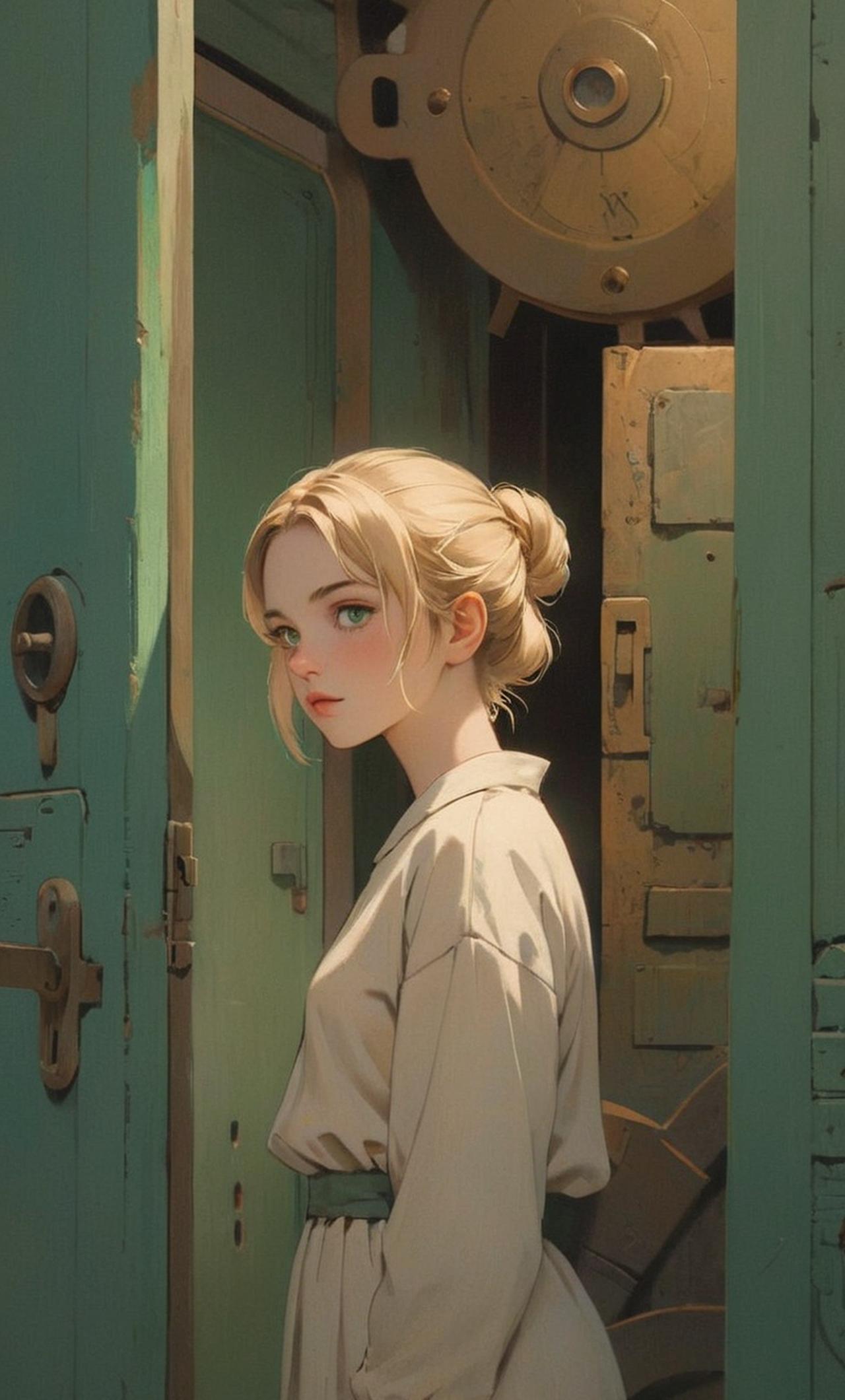 The protagonist is a young woman who has lived her entire life inside a secured underground shelter known as a 'Vault'. She has blonde hair tied up in a bun, striking green eyes, and delicate features. Having grown up without exposure to the harsh realities of the post-apocalyptic world, she is naive, curious, and kind-hearted. Motivated by her unfamiliarity with the outside world, she longs to explore and understand it better.