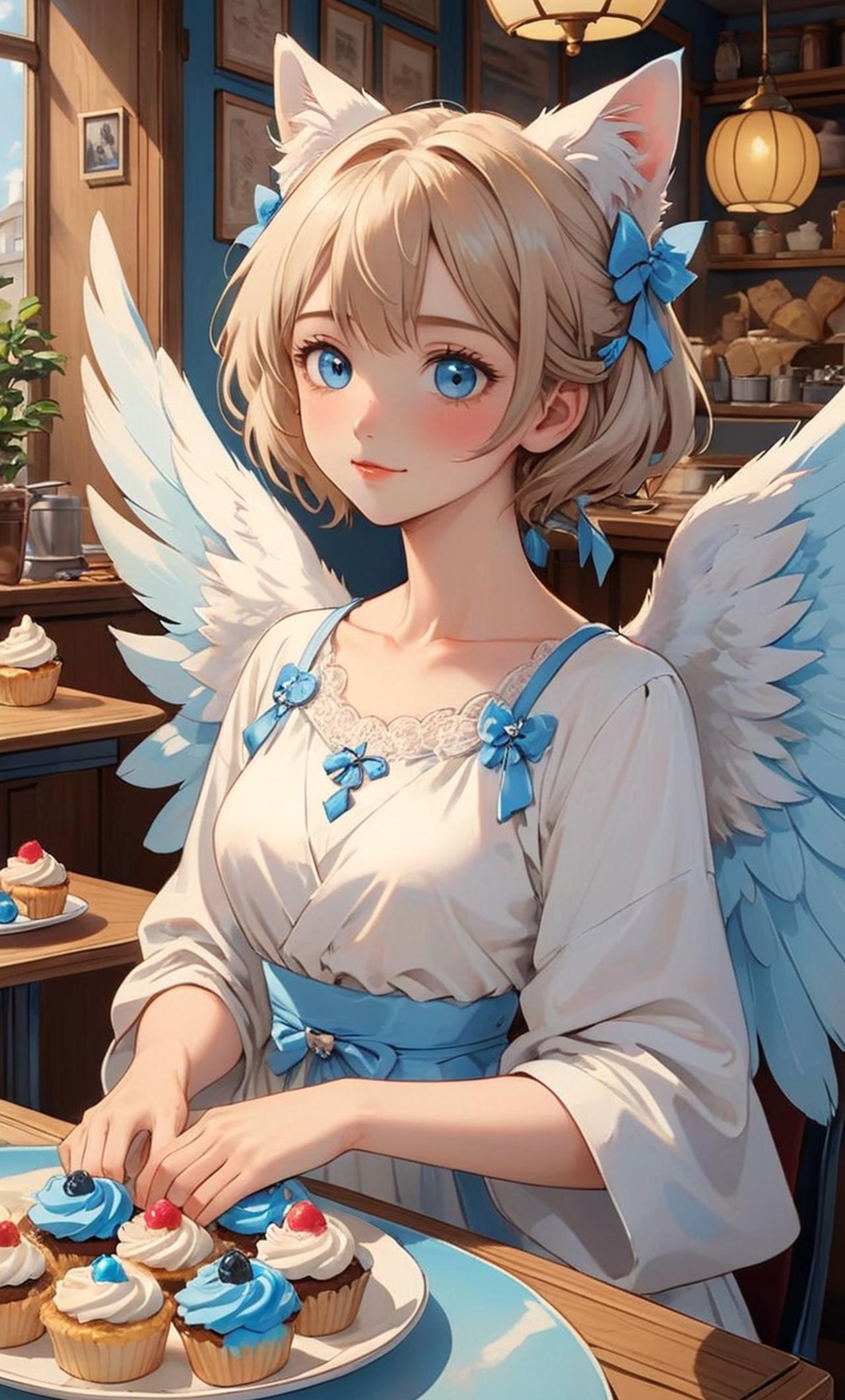 Half-angel, half-cat, half-dog, half-human creature with an adorable face, sparkling blue eyes, fluffy white fur, pointed angelic wings, cat-like ears and tail, and human hands. She carries herself with grace and poise, exuding kindness and gentleness. Originally from heaven, she now lives among humans, enjoying their company and culture. Loves good food and sweet treats.