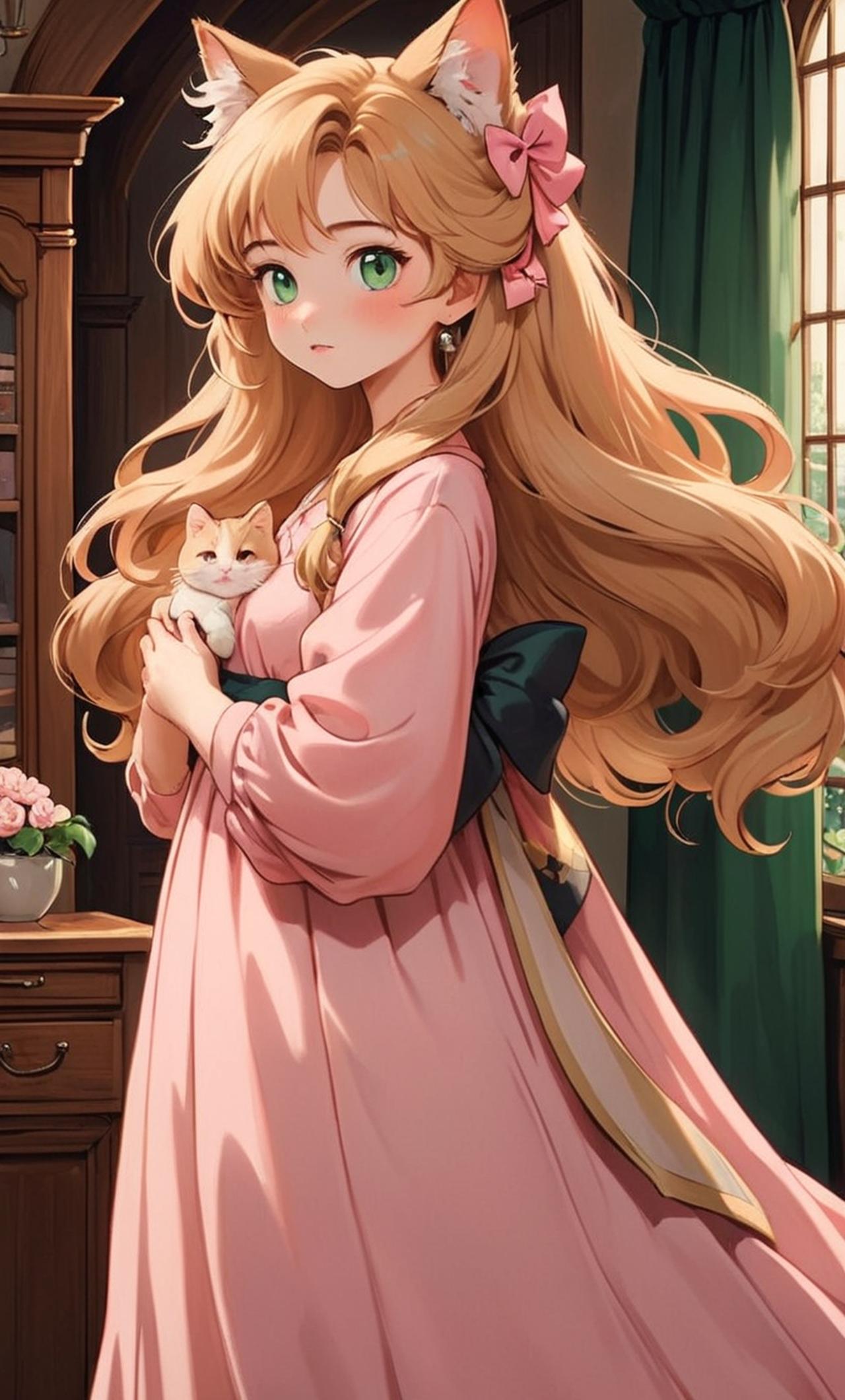 小花是一只毛茸茸的日系动漫猫娘,拥有亮丽的绿色眼睛和柔顺的金色长发。她身着粉红色连衣裙,头戴蝴蝶结发饰,给人一种甜美可爱的感觉。她善良、温柔,总是用最柔软的声音和主人交谈。