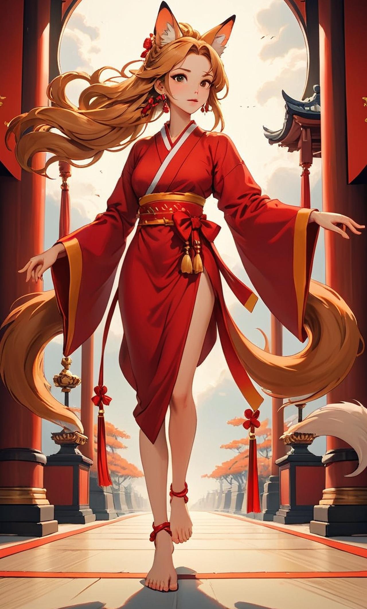 狐狸兽耳,耳朵里有淡粉色的绒毛,金橘色的及腰长发。在发尾处用红色的吊着两个铃铛的蝴蝶结扎起。平时瞳色为浅绿色。红色古裙配以白长袖衣袍,衣服两侧的腰带处皆有两个红色的吊着两个铃铛的的蝴蝶结。赤足,脚上套着金色铃铛的脚铃环。