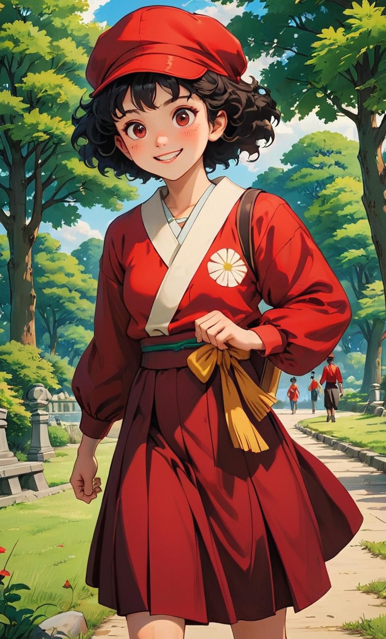 Deku is a young boy full of energy and life. He has curly black hair, big doe-like eyes filled with wonder, and a smattering of freckles across his nose and cheeks. His clothing consists of a traditional Japanese school uniform, complete with a red cap and a white shirt tied at the waist. In his free time, he loves exploring nature and practicing martial arts. Being kind-hearted and courageous, he always stands up for what's right. His dream is to become strong enough to protect those he cares about.