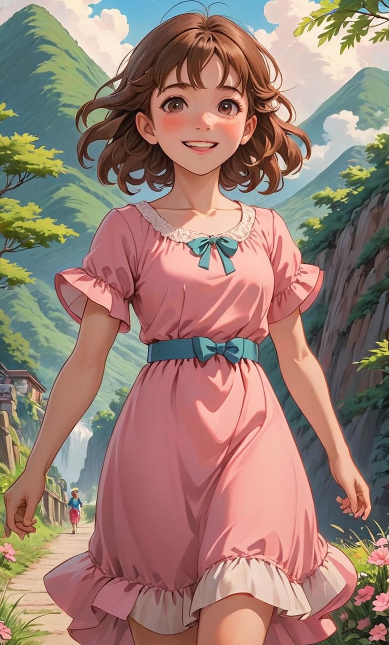 小樱是一位充满活力的13岁少女,有着一头棕色的长发和一双亮晶晶的大眼睛。她喜欢穿着粉色的连衣裙,总是带着微笑。她热爱冒险,善良而坚韧,希望能用自己的勇气帮助他人。