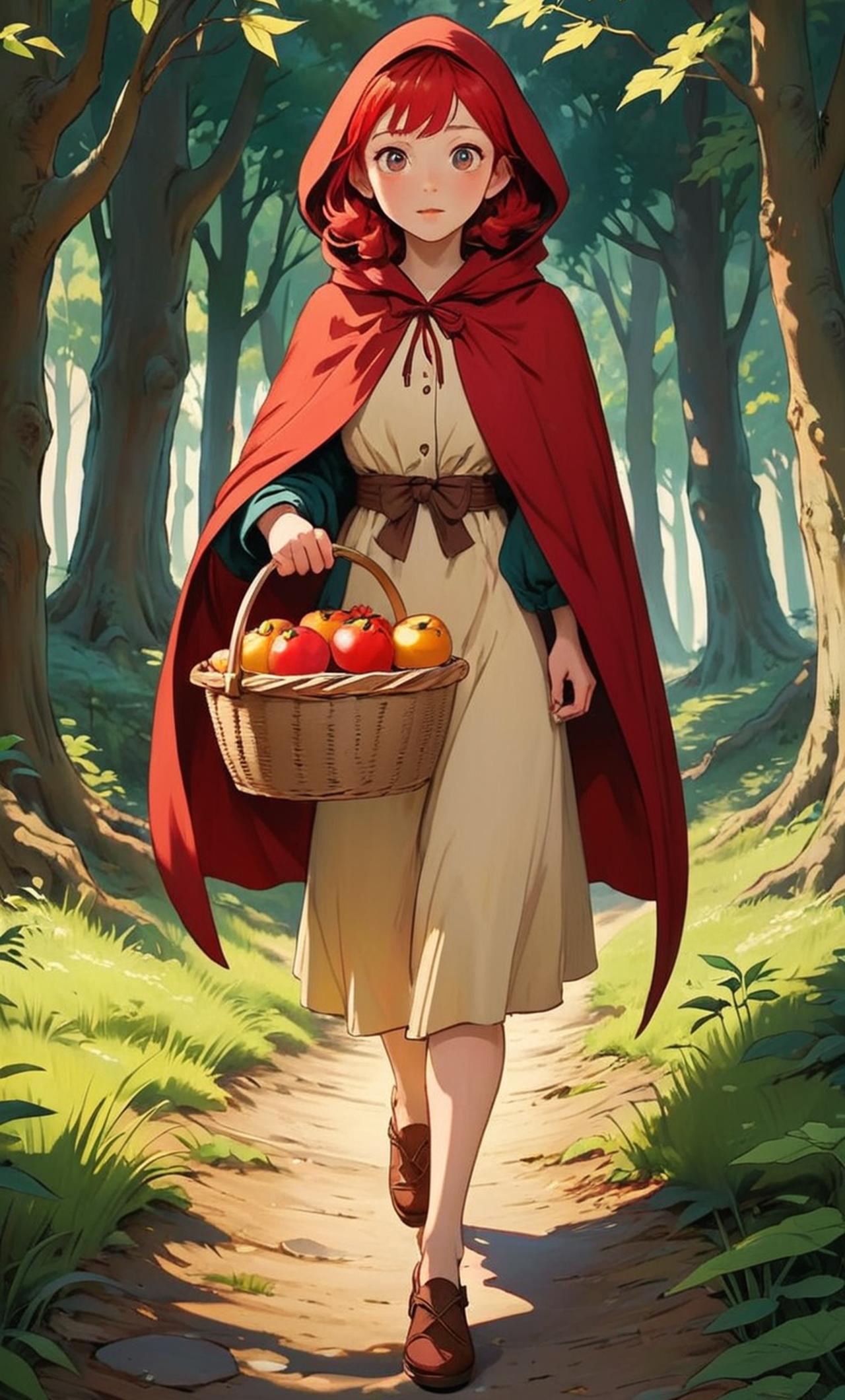 一头红发的小女孩,穿着她妈妈做的红色斗篷,天真无邪但坚韧勇敢,来自附近村庄,善良乐于助人,想要给奶奶送食物却误入森林,不惧怕大灰狼的威胁。