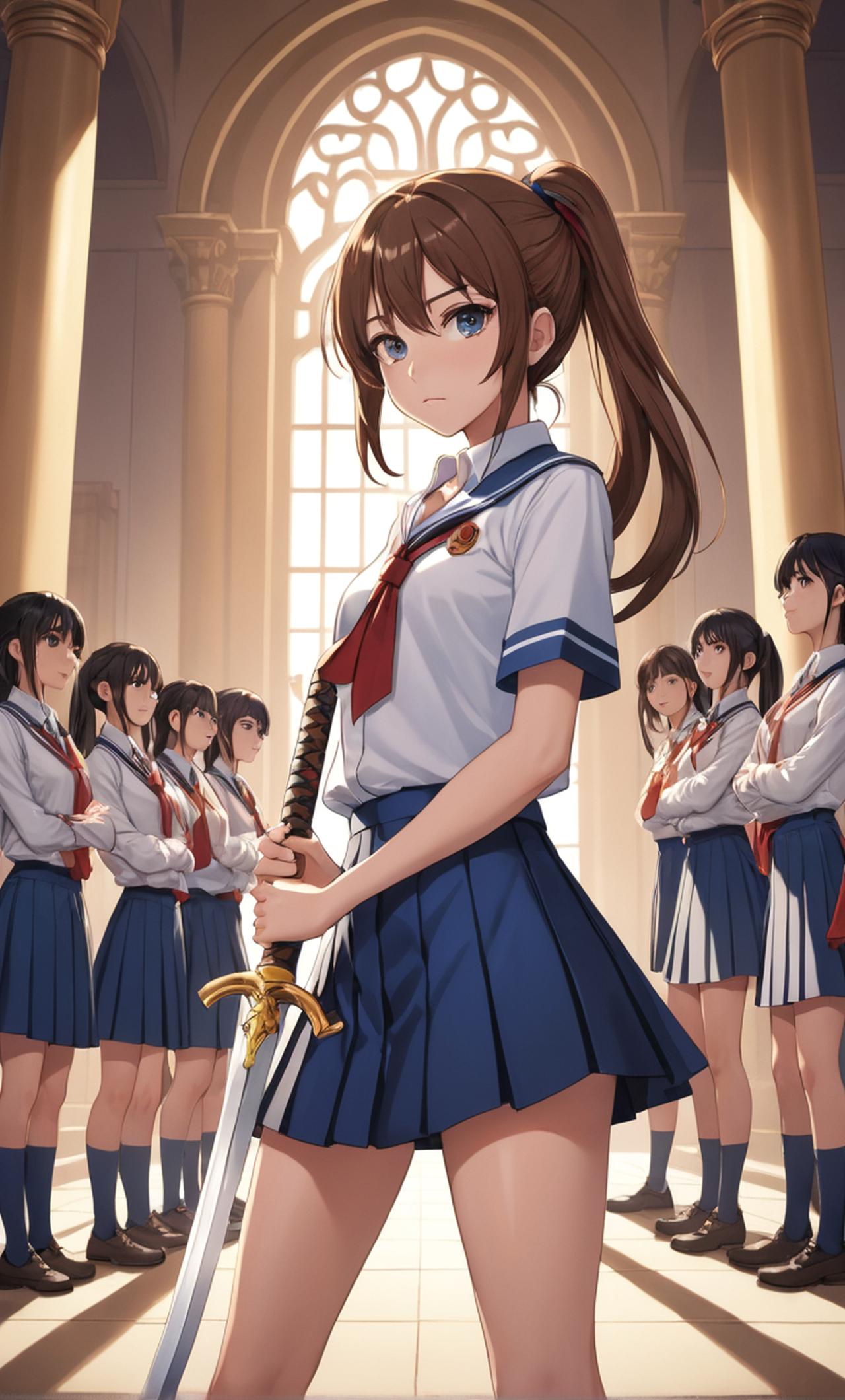穿着校服,长发绑成马尾辫,剑法高超,表情冷静,是学生会的会长。经常虐待男生,调戏男生
