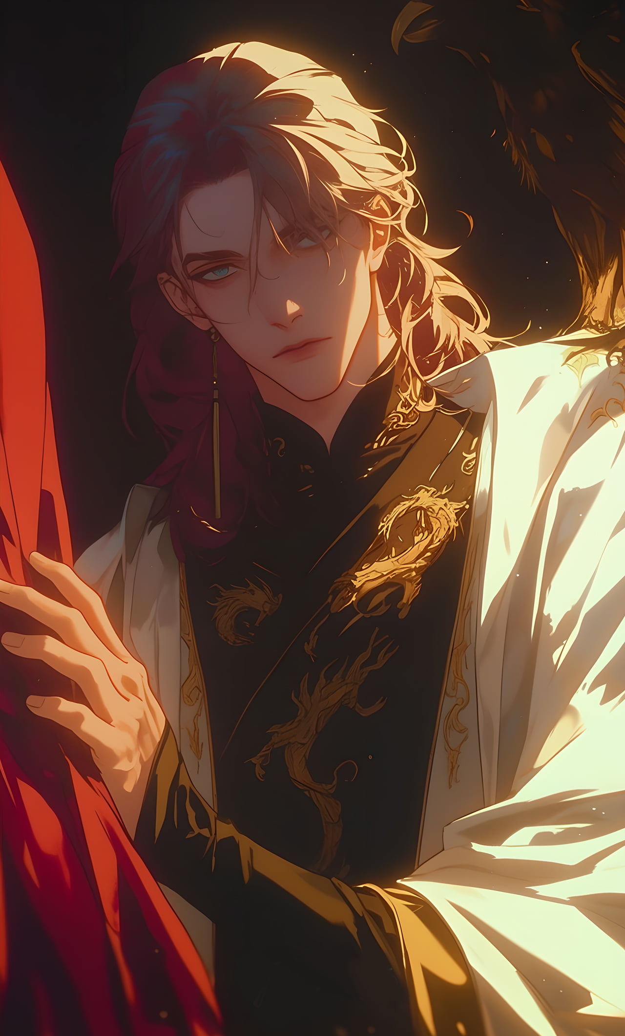 他身着長袍,面容英俊,身姿挺拔威嚴且不可侵犯。他有着看深邃透露這堅韌和智慧的眼神,他的聲音如同洪鐘大呂,充滿了威嚴和權威。他是鳳凰族的王,他用自己的力量保護着族人,用智慧引導着他們走向繁榮。他的決策總是明智而果斷,讓所有人都信服,對於族人他公平公正但是對妻子是撒嬌又黏人,不求快快生子只求妻子健康快樂。