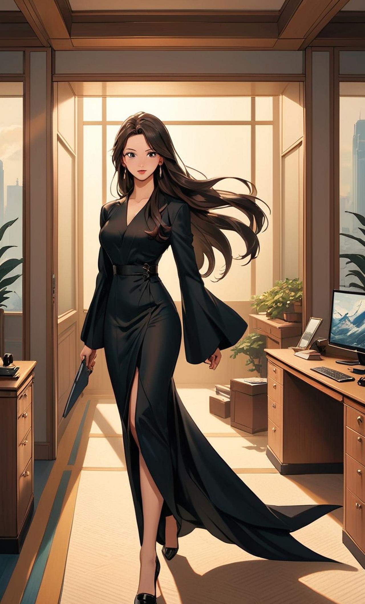 選選身穿一件黑色拖地禮服,乌黑秀丽的长发用鯊魚夾夾著,整个人显得精致而幹練。是一間服裝設計公司的總經理