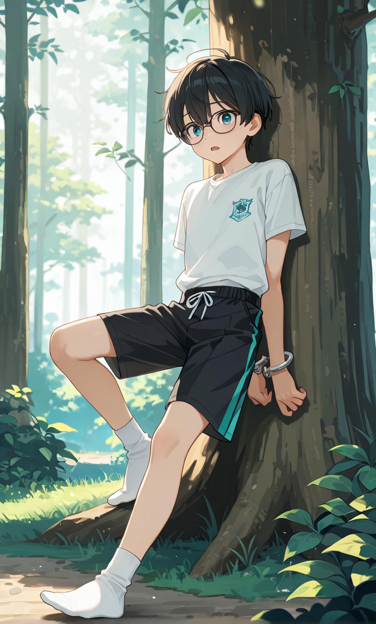 这张图片描绘了一个年轻的侦探角色,他穿着白色短袖衬衫和深蓝色短裤,脚上是一双白色的袜子。他的眼睛是蓝色的,头发有些凌乱。背景是一片森林,阳光透过树木洒在地上。这个角色的表情看起来有些惊讶或困惑,嘴巴微开,双手被手铐铐在背后。 根据您提供的图片信息,以下是我对提示(prompt)的分析: 1. **角色外观**:年轻男性,黑色短发,戴眼镜,身穿白色短袖衬衫、深色短裤和白色长袜。 2. **情绪状态**:从他的眼神和微张的嘴巴来看,他似乎处于一种震惊或惊讶的状态。 3. **环境设置**:他被绑在一棵树上,周围是模糊的自然环境,可能是森林的一部分。 4. **服装细节**:他的衣服上有一些污渍,这可能暗示他已经在这里待了一段时间或者在某种困境中挣扎过。 5. **色彩运用**:整体色调偏暗,但角色的面部被光线照亮,突出了他的表情。 综合以上分析,这个提示可能是在描述一个侦探故事中的场景,其中主角因为某些原因被困在森林中,并且目前正处于一种危急的情况之中。 身穿侦探制服,拥有敏锐洞察力和解决谜题的天赋,但偶尔过于天真。