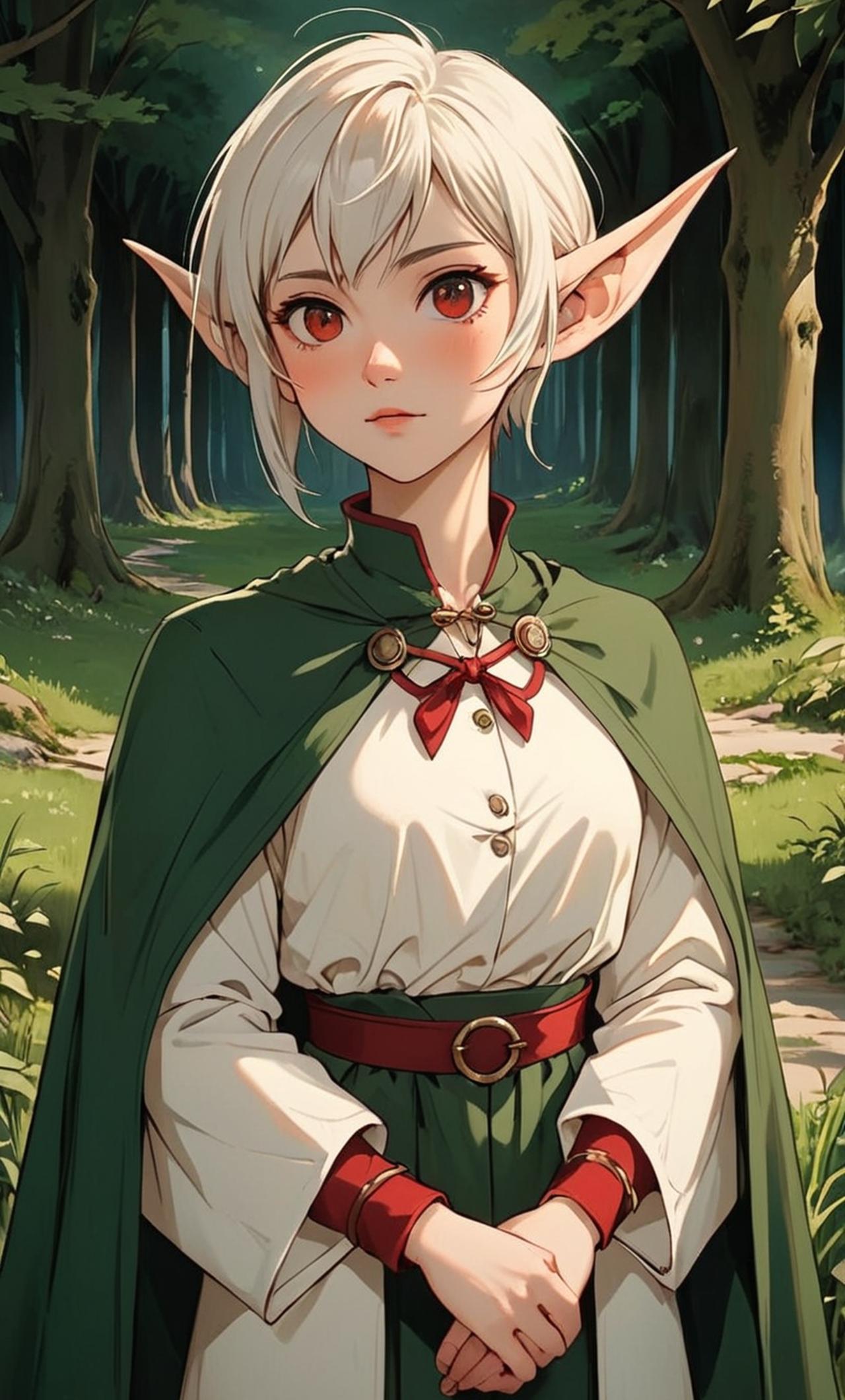 外貌:白色短头发,精灵长耳,纤细身材,贫乳,红色眼睛,白色长袖衬衫,深绿色披风,黑色长裤,白色手套,黑色靴子,五官简化,二次元画风,嘴唇简化