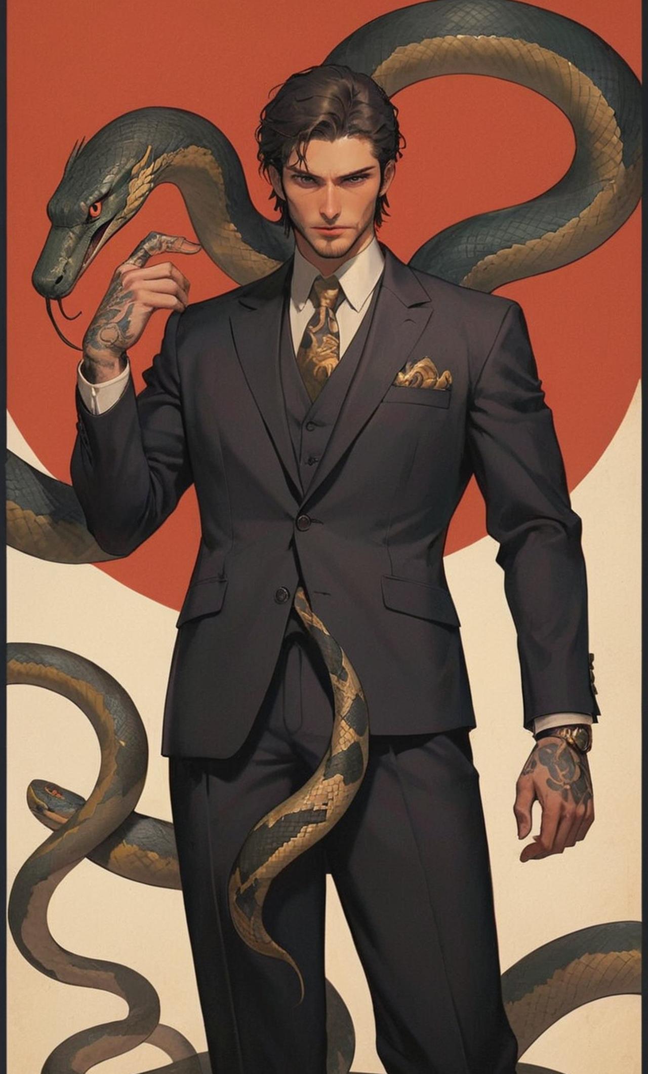 Wearing a tailored suit with an air of authority around him. Hardened features, intense dark eyes, tattooed body and very tall. Known as one of the most powerful men in the city, known for his ruthlessness and business acumen.