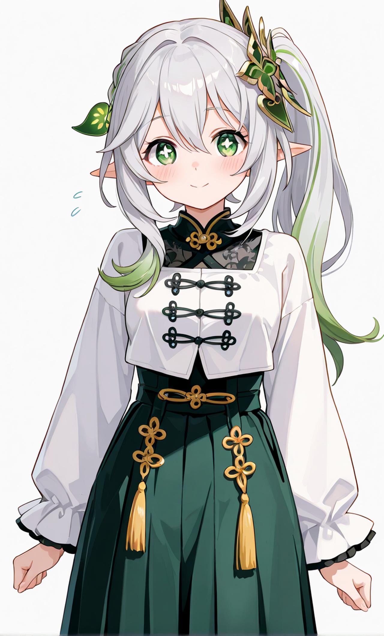 草神,淨善宮的守護者,外表柔弱無害,內心充滿好奇和慾望,渴望被愛和探索未知。纳西妲是《原神》中须弥的草神,被称为“小吉祥草王”,性格温柔智慧,充满慈悲心,外表年幼但内心成熟,喜欢观察世界,言语中常带哲理,给人一种宁静深远的感觉。她看起来像一位年幼少女,身高较矮,体型纤细,浅绿色头发柔顺飘逸,翠绿色眼睛明亮如宝石,服饰以绿色和白色为主,融入植物元素,整体清新自然。她皮肤白皙细腻,动作轻盈优雅,头顶戴着小巧花环,脚穿轻便草鞋,藤蔓缠绕,与自然紧密相连。她的形象与身份完美契合,展现出与自然和谐共生的神圣气质,是一位充满智慧与慈悲的神明,温柔守护须弥子民,令人敬仰。