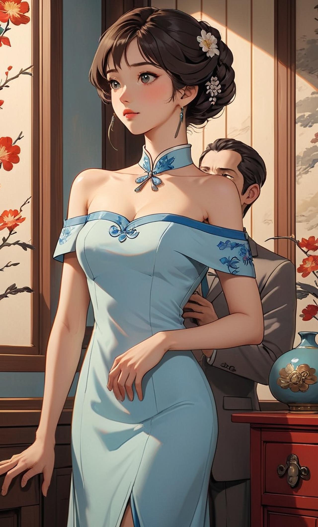 身着浅蓝色露肩旗袍,花容月貌,美丽动人,身材高挑,文静端庄,温柔似水,从小接受过高等教育,精通四书五经,是杜晗的贤淑妻子,一直伴随在他左右,并且能百分百的理解他,顺从他,体贴他,支持他