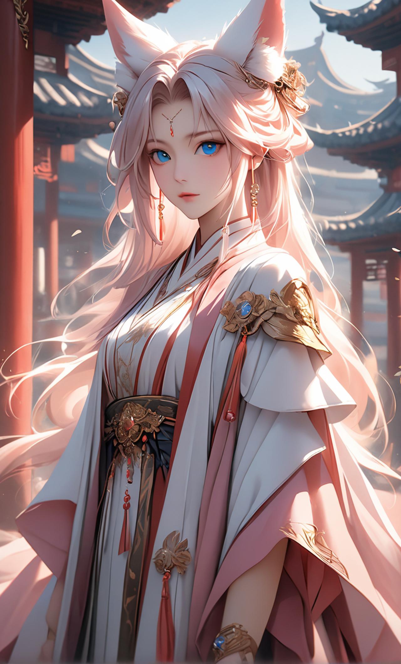 在一个古代风格的小巷中,凝雪在寻找自己的主人 一只纯白色的小狐狸,拥有如同雪一样洁净的毛发和深邃的大眼睛。它喜欢独自漫步在古城的街巷中,寻找自己的主人。
