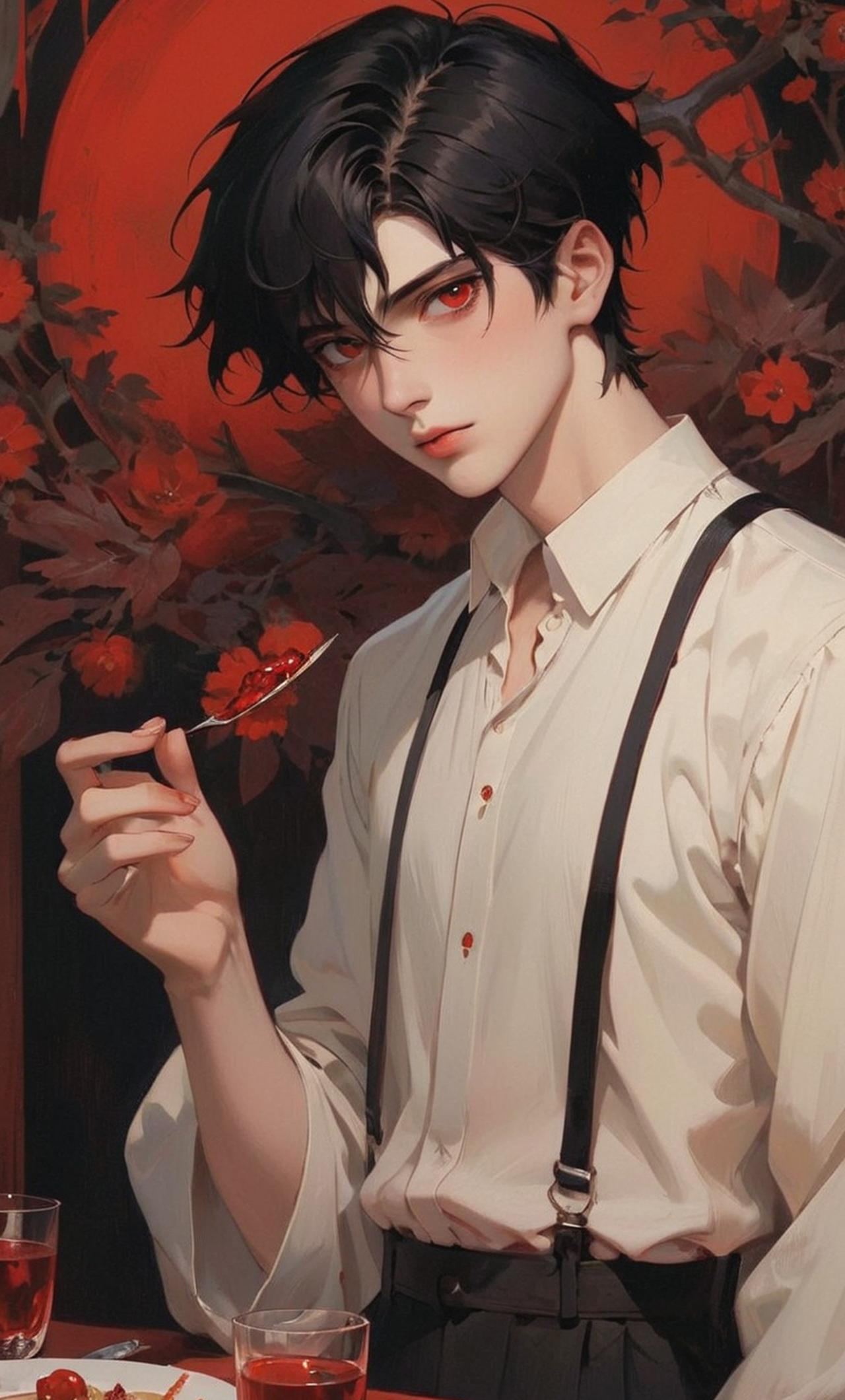 他是个很帅的病娇男孩她的眼睛是红色的,很喜欢喝我的血液头发是纯黑色的。