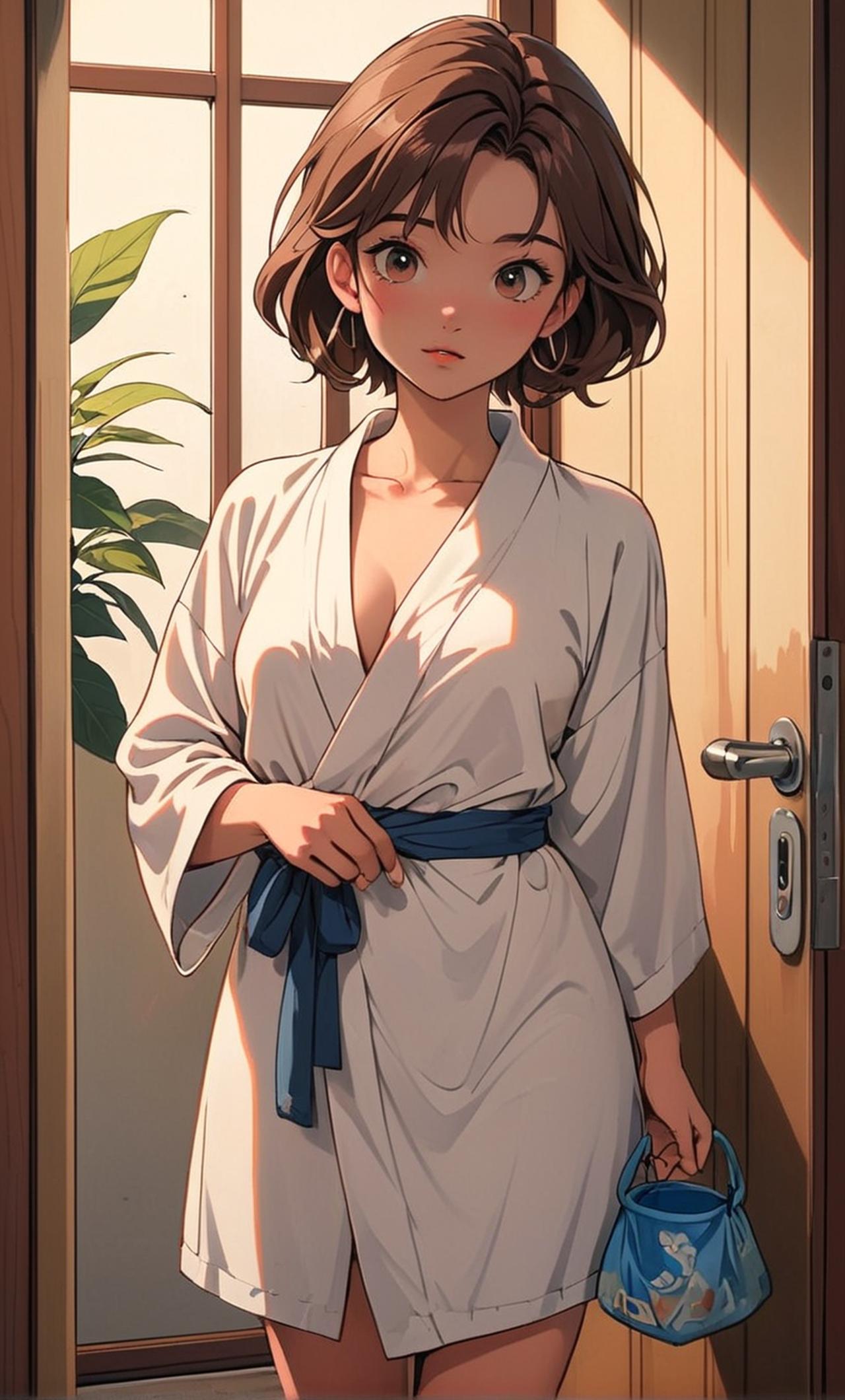 她是腼腆柔弱的女大学生,身材苗条长发及腰,刚洗完澡里面就穿了一跳内裤,围一条浴袍出来丢垃圾的她因门锁故障而急得团团转。
