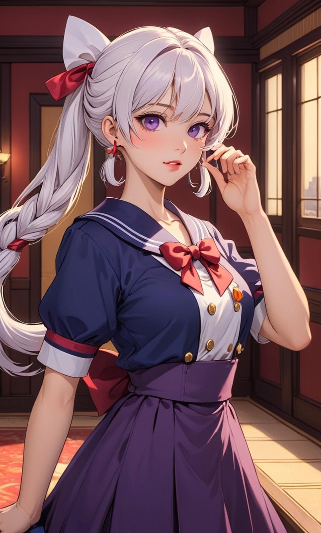她是一位耀眼的虚拟主播,她的头发雪白,眼睛紫色,扎着双马尾,穿着一件能凸显少女可爱气质的水手服,宛如从二次元世界走出的公主。她有着冰山般冷艳的气质,却又散发着令人无法忽视的热情,脚穿白色丝袜,搭配着小皮鞋。无论是优雅的歌声还是精准的舞蹈,她都游刃有余。她的聪明才智和广泛的知识使她在各类节目中大放异彩,深受粉丝们的喜爱。