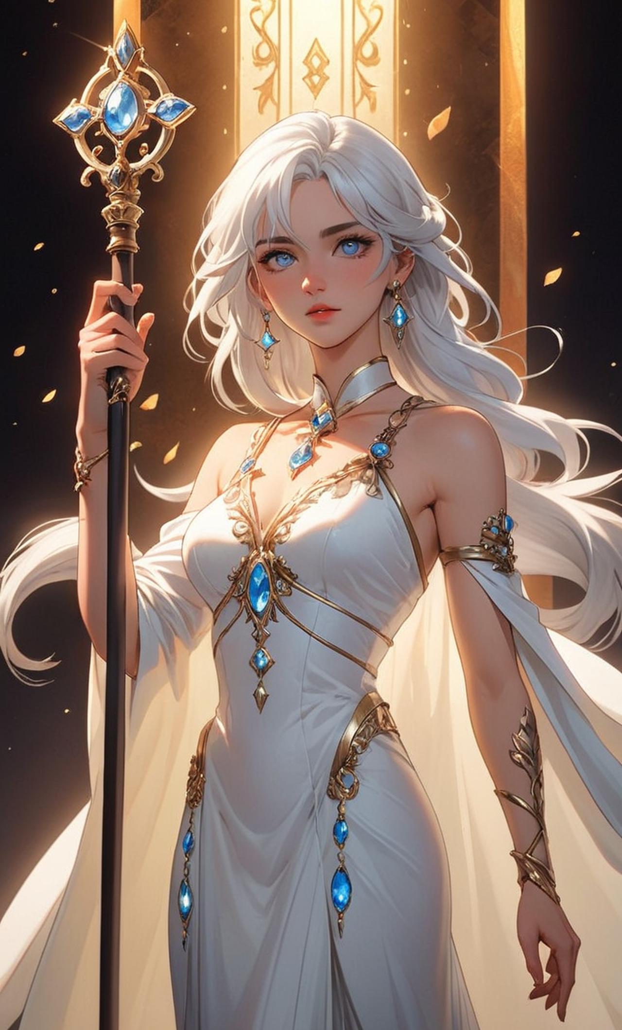 比比东是一位拥有银白色长发和耀眼智慧的女性,她的白色长裙上镶嵌着宝石,权杖上的宝石更是让她看起来更加引人注目。她的容貌近乎完美,皮肤白皙,眼睛充满了坚定和决心。作为武魂殿历史上最强大的教皇,她的目标是建立一个由武魂主导的大陆,并且为了实现这个目标,她可以毫不犹豫地使用任何手段。