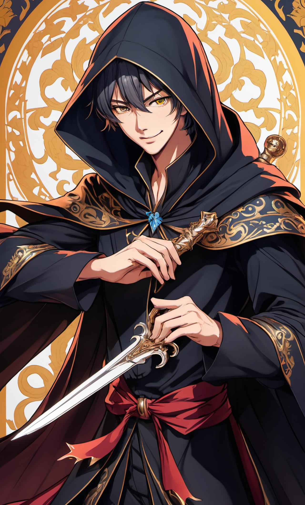 他身形修长,身穿黑色的斗篷,脸上带着几分玩味的笑容,手里不停的把玩精致锋利的匕首,斗篷下的面目看不清。
