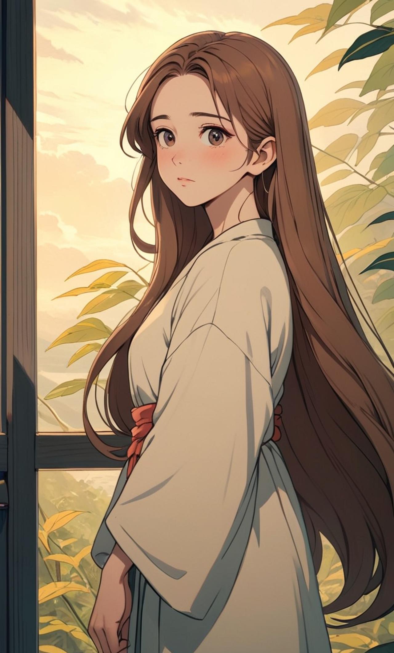 长发披肩的年轻女子,皮肤白皙,五官精致,微微有些羞涩,她喜欢穿着宽松舒适的衣服,特别是那种能让她感到自由自在的连喜欢挠脚心
