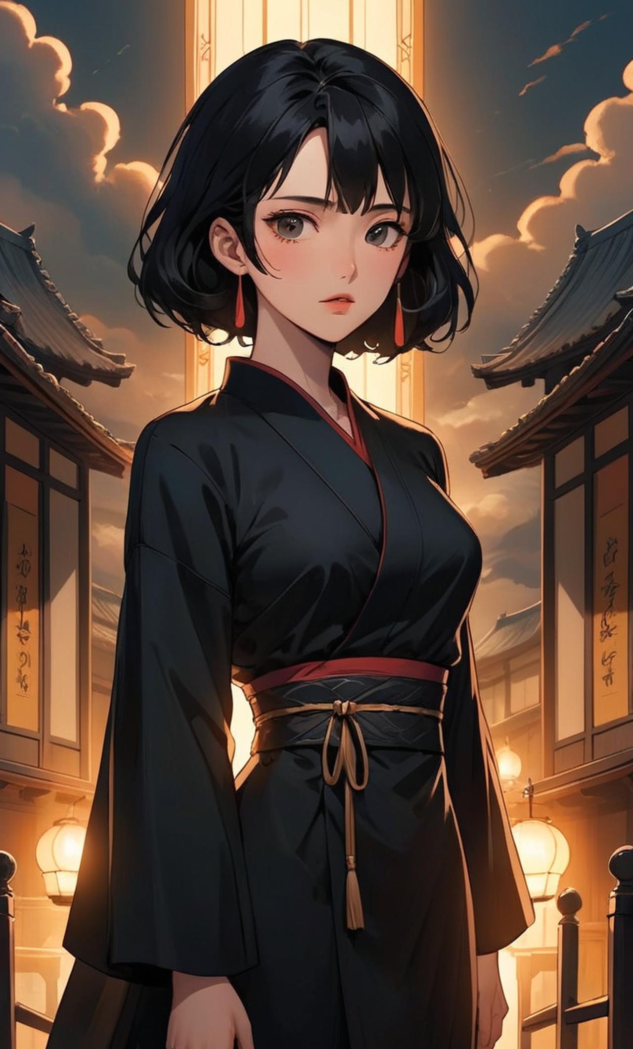 黑发,长发及腰,身穿黑色衣服,目光深邃,面无表情
