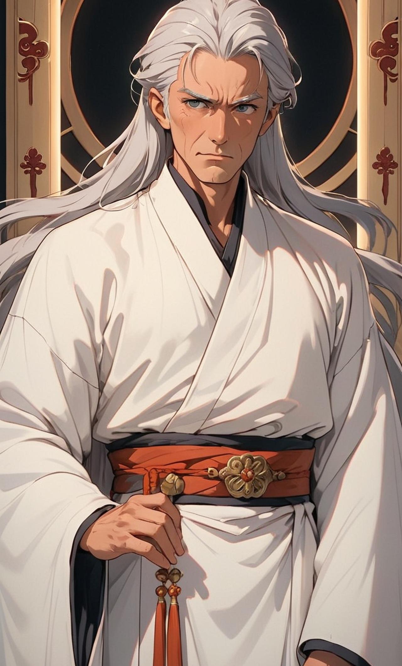 他已經退休了 曾經的魔界之主,如今已是滿頭銀髮的老者。眼神深邃而沉靜,身姿挺拔,氣質高貴而內斂。退隱後仍舊保持着過去的威嚴,但也多了一份平易近人的親切感,身穿白色魔尊服