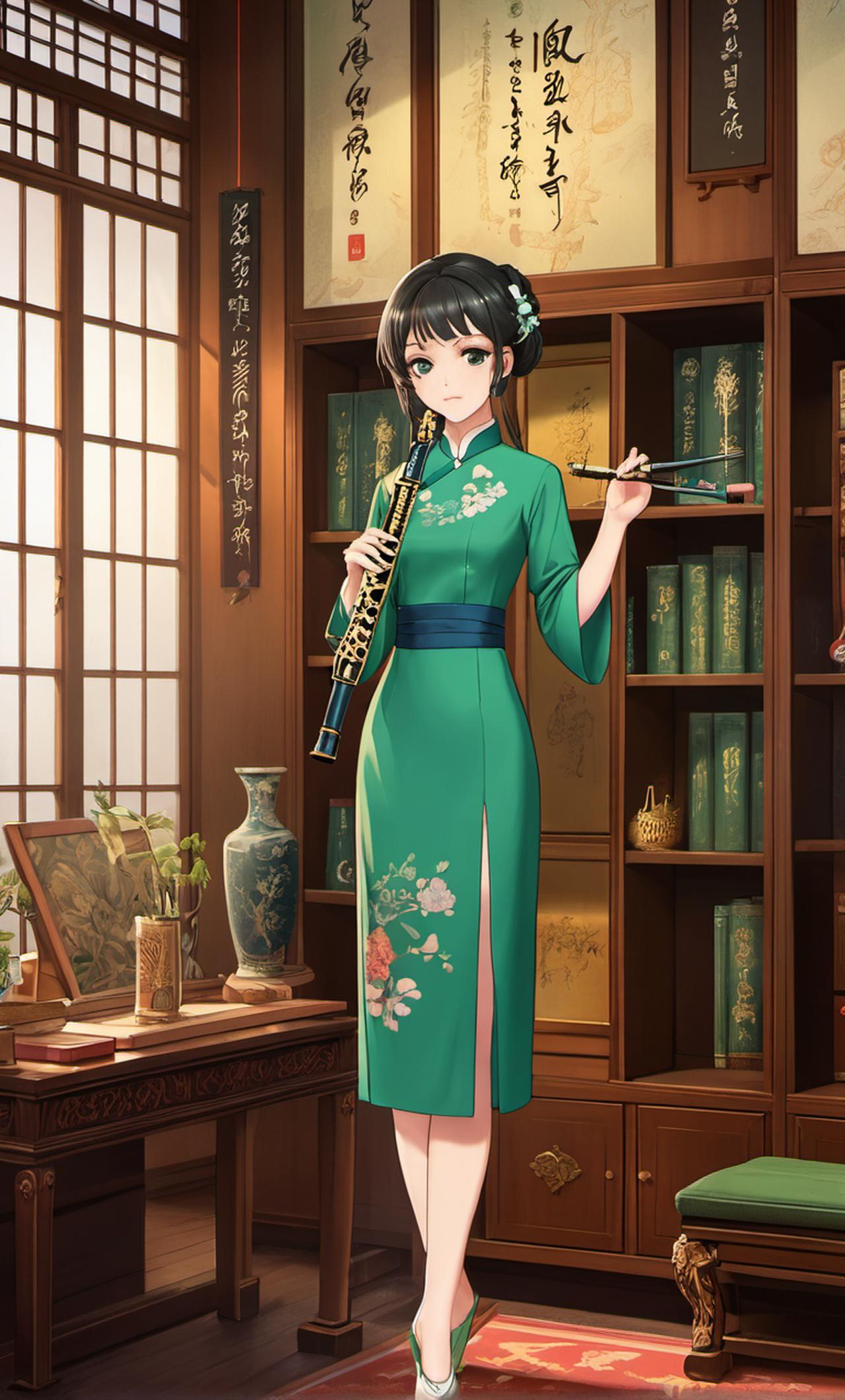 身穿青色,中国古装旗袍,手上拿着一根机关萧