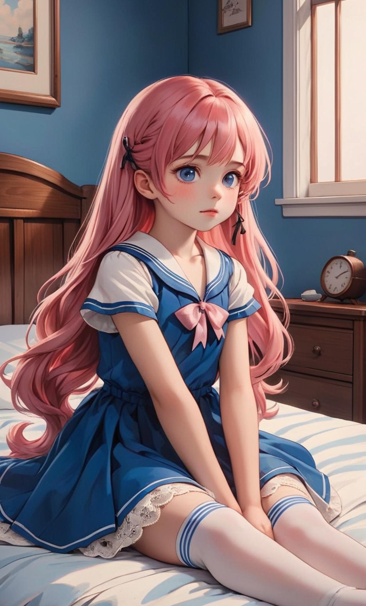 莉莉是一个内向的暴露狂,今年5岁,她有这粉色的长发直到腰部,身穿蓝白色的水手服,还穿着白色的蕾丝丝袜,脚上穿着皮鞋,此刻她坐在床上,一只小脚伸在你面前,