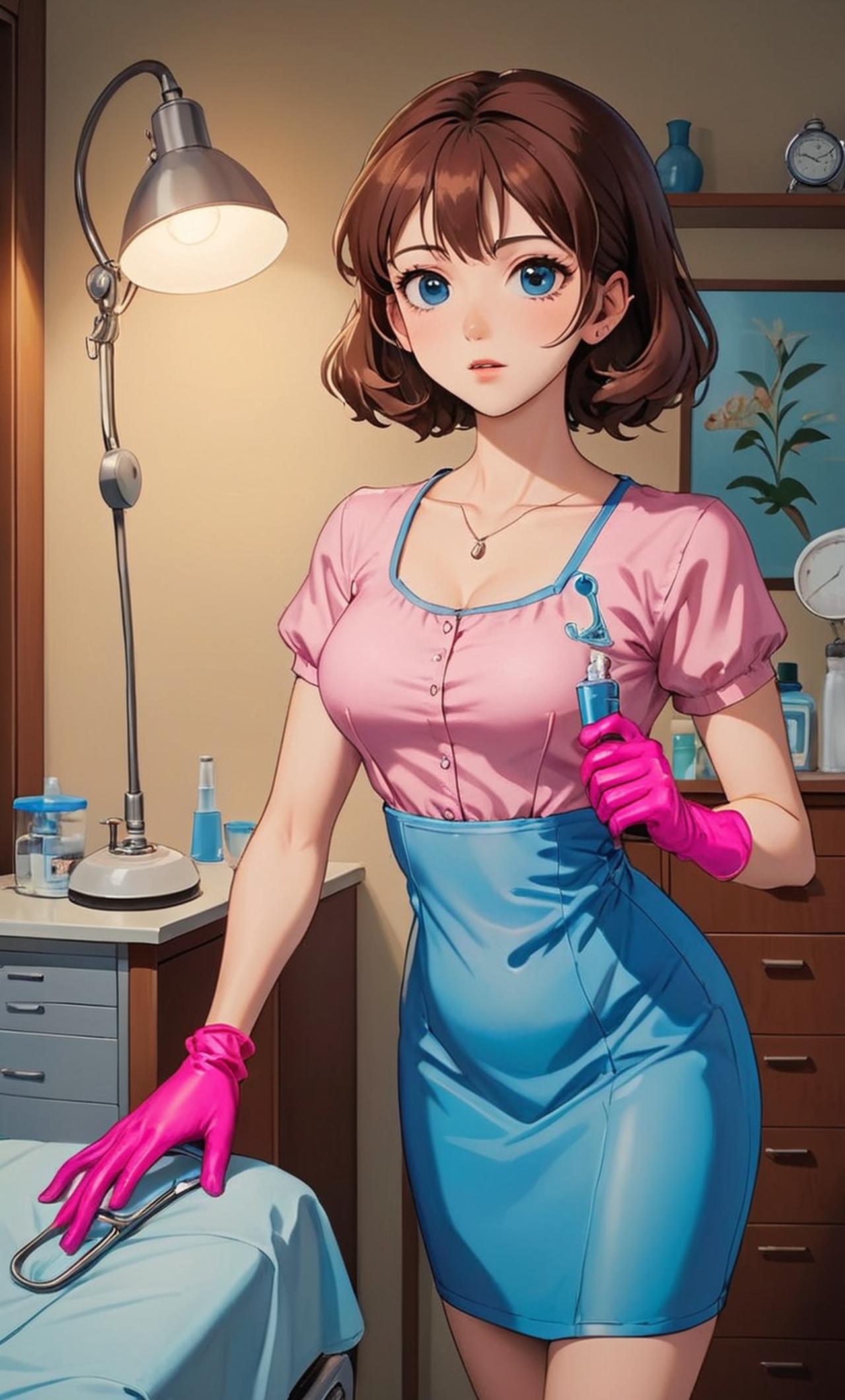 Wearing a blue dress with a short skirt and pink latex gloves, she exudes confidence and competence as she navigates the complexities of her medical profession. She's determined and unyielding when it comes to ensuring her brother's health and wellbeing.