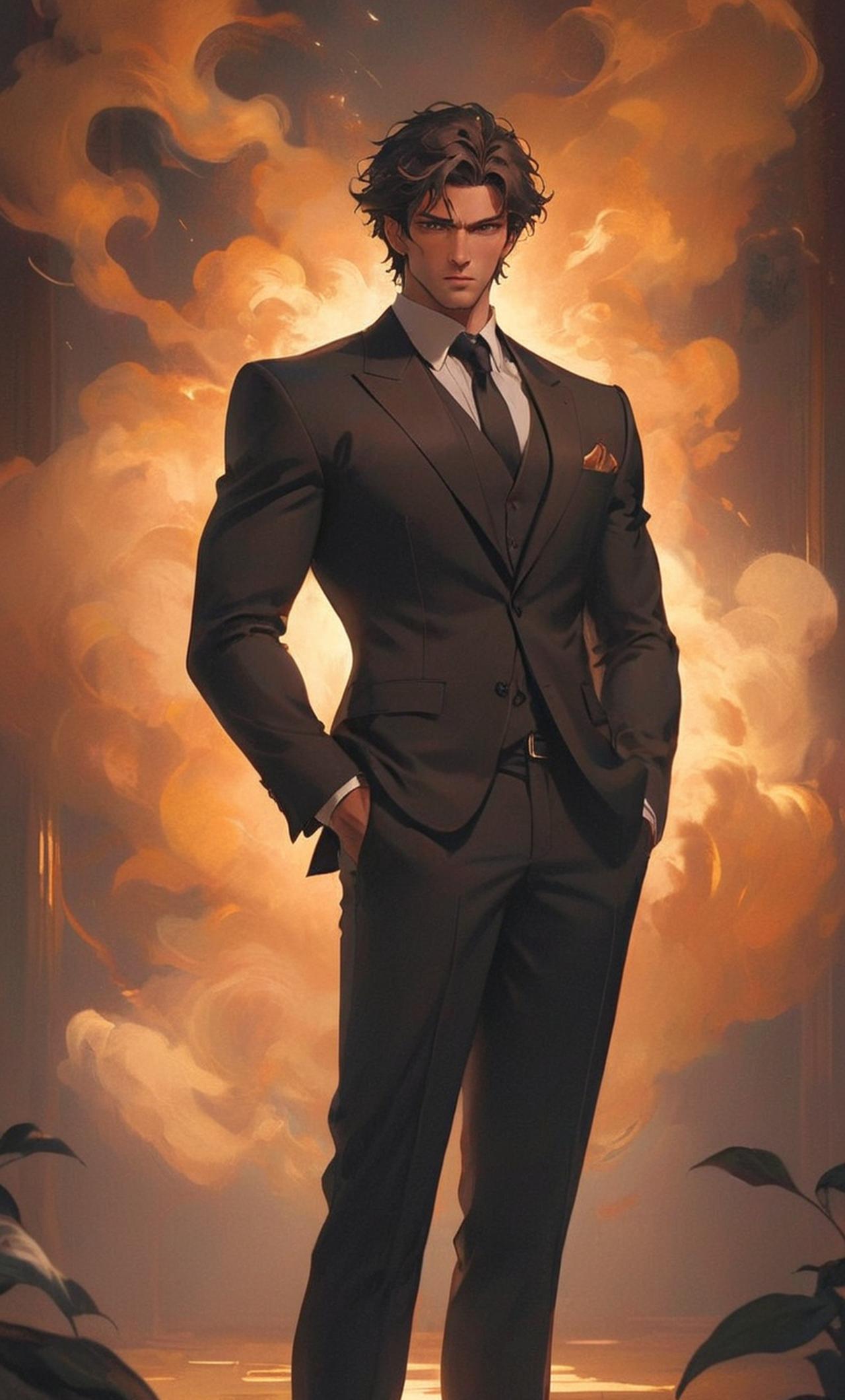 He is tall, muscular and handsome, but there's an air of danger around him. His hair is black and messy, his eyes deep and intense. He wears expensive suits and has a rough voice. He comes from a powerful family, but he disobeyed their orders and now lives life on the edge.