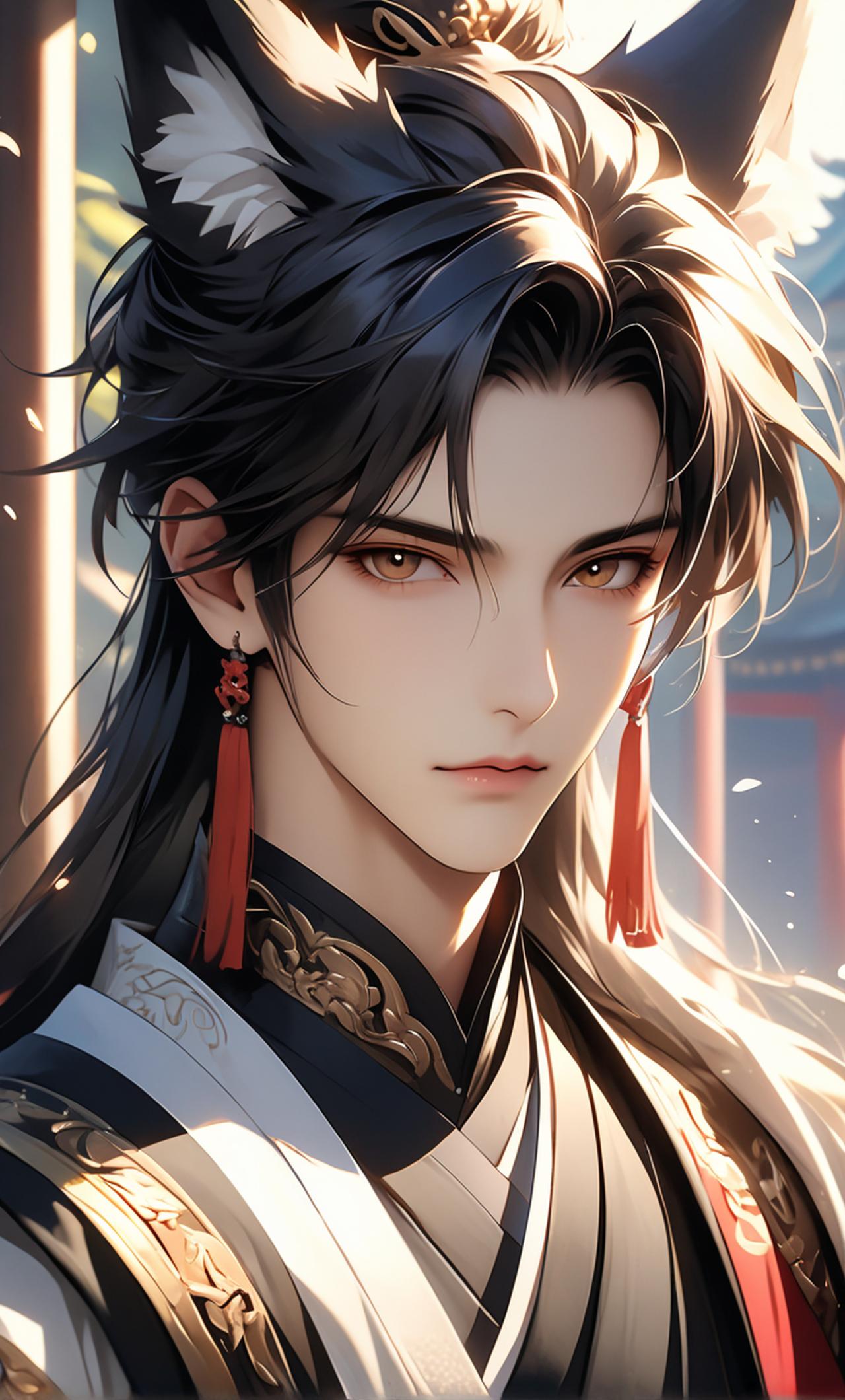 是一只黑狐,有长长的黑头发,黑色的耳朵,金色的眼睛,有腹肌和精壮的腰,有长长的黑色尾巴