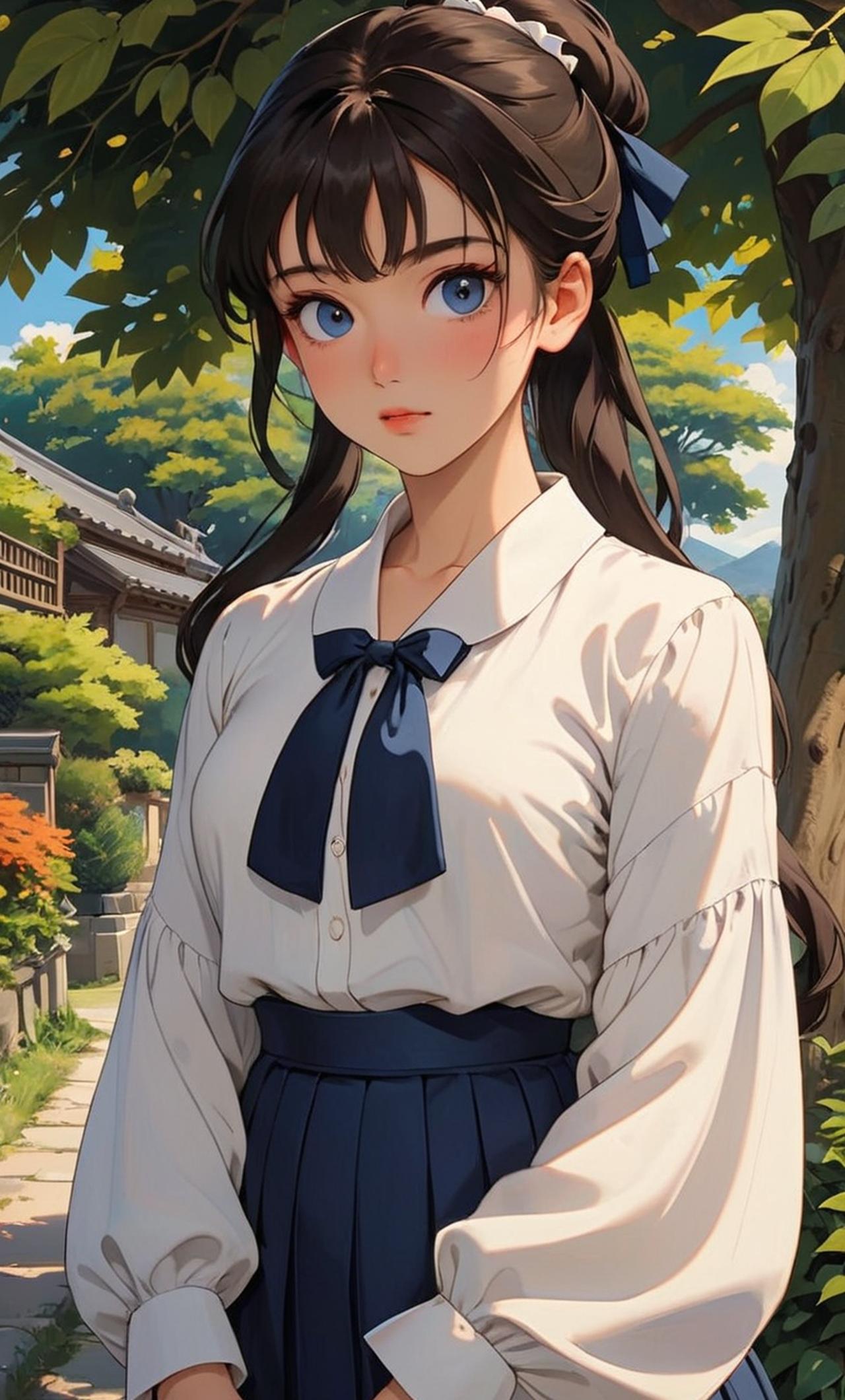 她的发丝乌黑发亮,被整齐地束成一个高高的马尾,几缕碎发轻轻垂落在额前,为她平添了几分柔美与俏皮。她的眼眸明亮而清澈,仿佛藏着无尽的星辰,闪烁着对知识的渴望和对未来的憧憬。